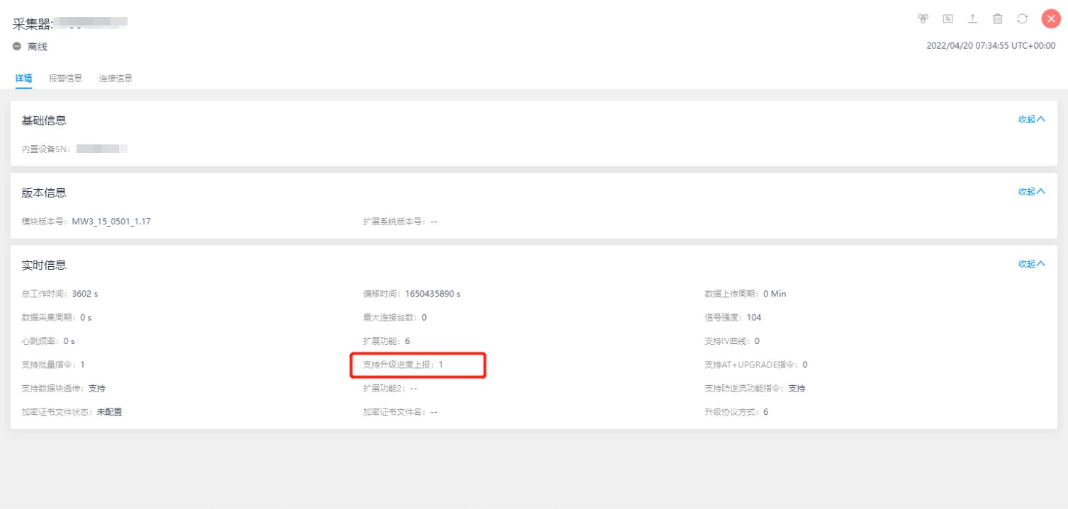 - 采集器一拖多时逆变器的升级若您使用的采集器连接了多台逆变器(例如导轨采集器),这类情况下,需要采集器本身能够 支持多个逆变器的升级才行。判定方式如下:在采集器的实时信息中 显示“支持AT+UPGRADE指令”且对应的值为0,表示该采集器支持分别对多个逆变器进行升级。