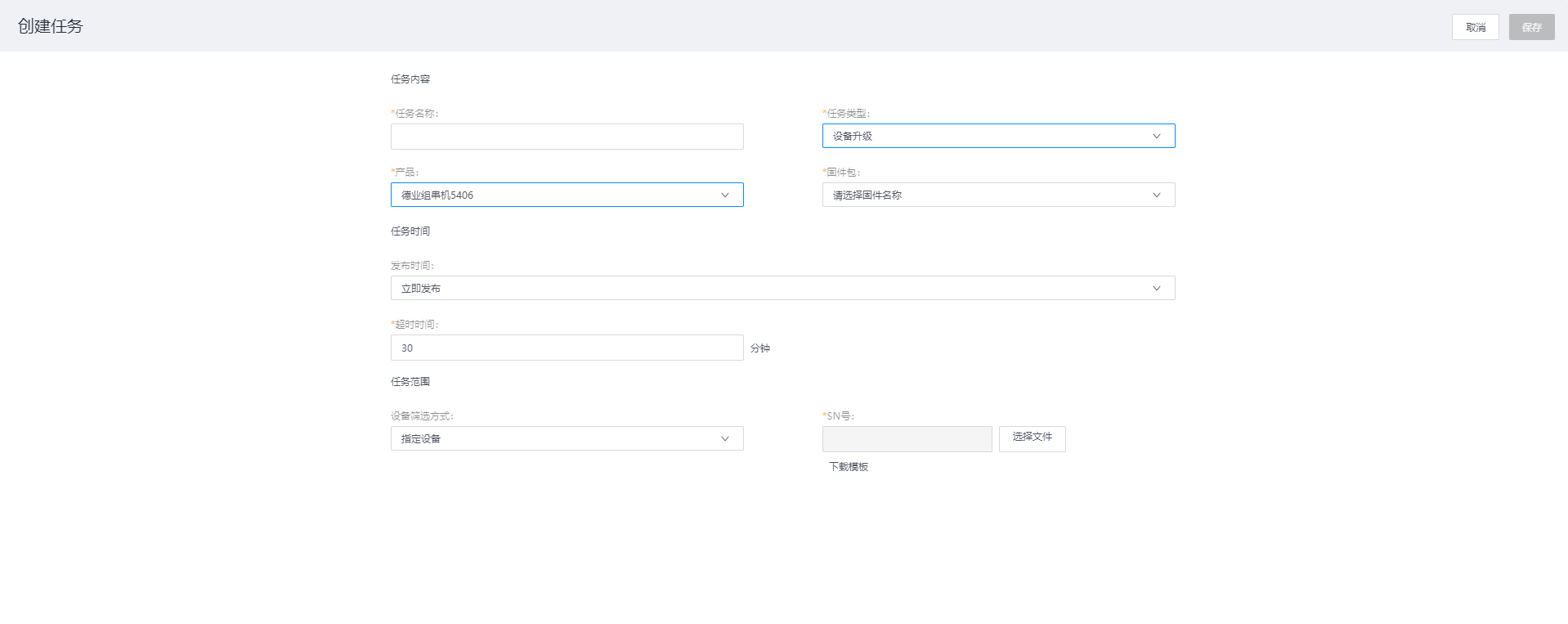 - 批量升级请您在批量任务模块选择点击【创建任务】进入创建任务界面。然后按照提示完善相关信息,其中"SN号"处,您可以下载模板进行填写,之后上传文件即可,待填写完所有信息后,点击【保存】即可开始批量升级任务。关于升级成功与否的判断,请参考单个设备升级的说明