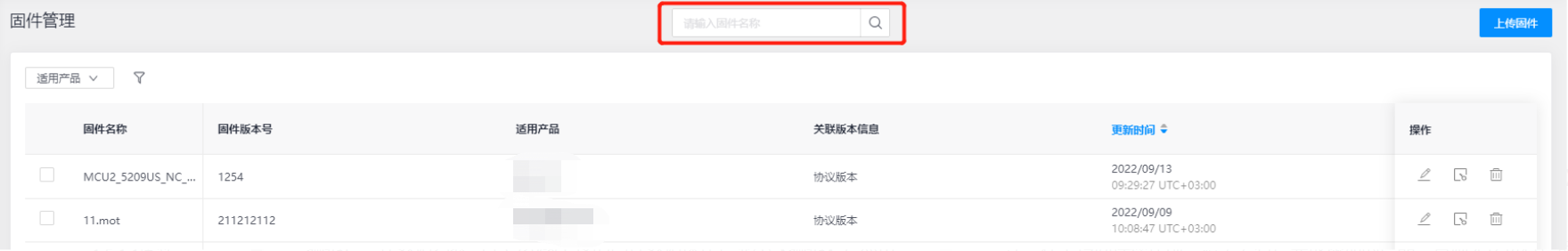 - 固件查询: 可输入固件名称进行查询固件数据,系统会根据您输入的固件名称进行模糊查询从而快速搜索对应固件数据记录信息,如图所示:
