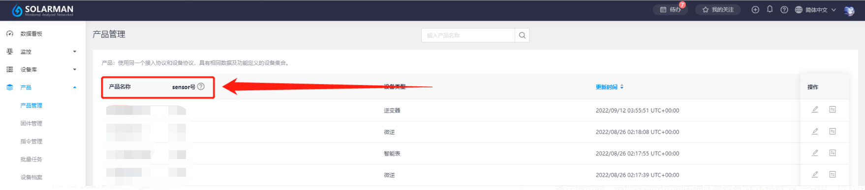 - Sensor 检查请选择点击【产品管理】进入产品管理界面,确认您账号下存在产品/sensor,若没有则无法进行设备升级----请联系平台配置对应的产品/sensor。