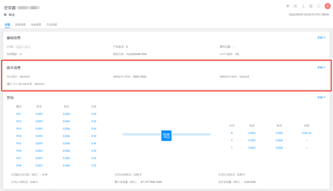 - 版本参数检查请您选择点击产品名称,在弹出的设备列表中任意点击一个设备SN,打开设备详情页面,请您在弹出页面中确认是否有“版本信息”这一分组、以及该分组下的参数是否为您需要升级的版本,若没有您需要升级的版本,请联系平台进行配置。