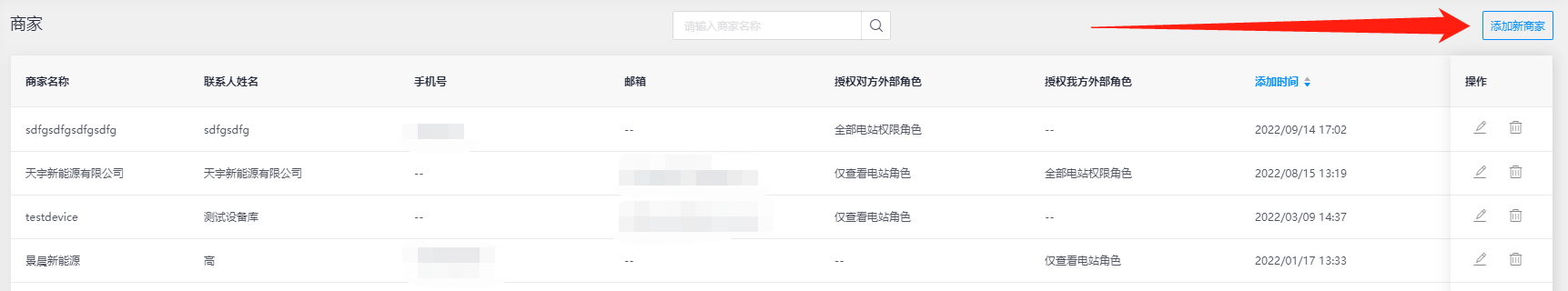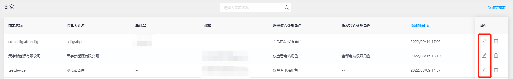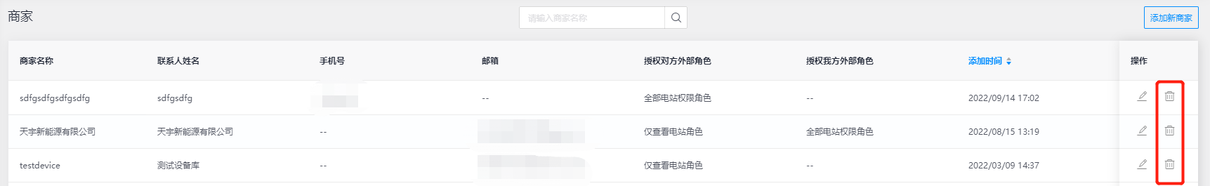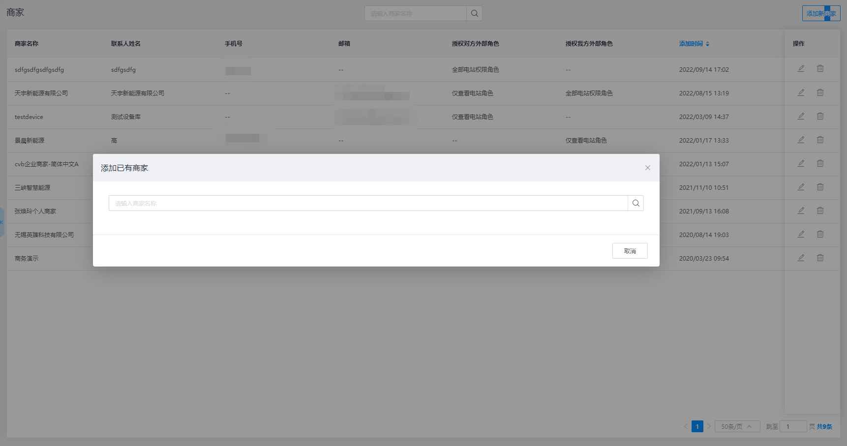 在【商家】模块中汇总通过外部关系所创建的商家信息,也可在该页面添加新商家、编辑和删除商家等功能操作,满足您对外部客户公司主体的商家账号添加和管理。