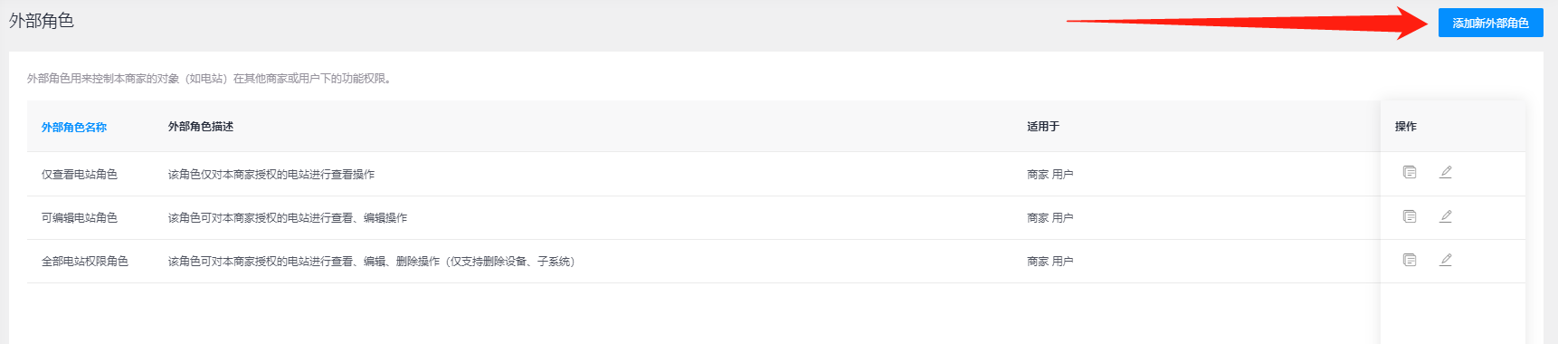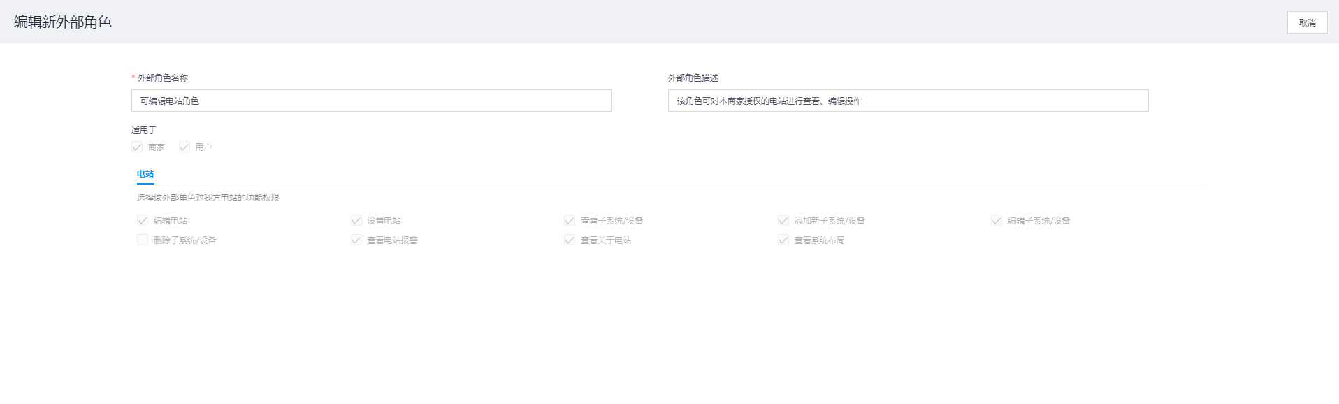 - 编辑: 若需要对外部商家权限进行修改时,可选择点击商家列表操作栏中的【编辑】按钮,对该商家的数据及功能权限进行修改,只包含您对该商家所授权的电站信息,没有进行授权的电站则无法查看