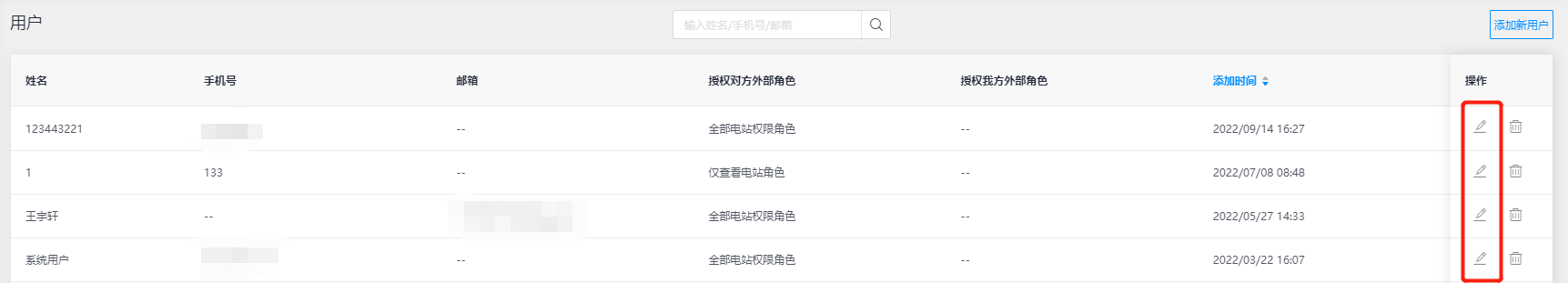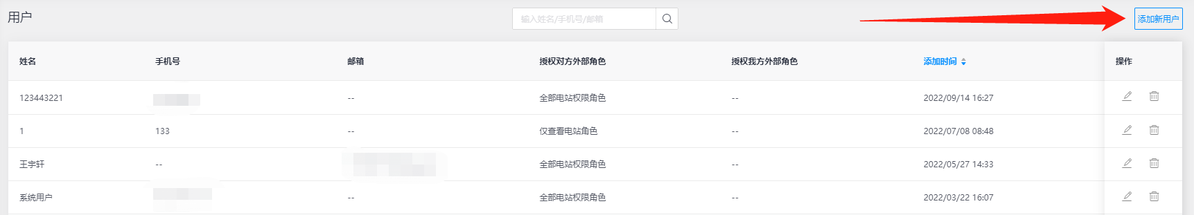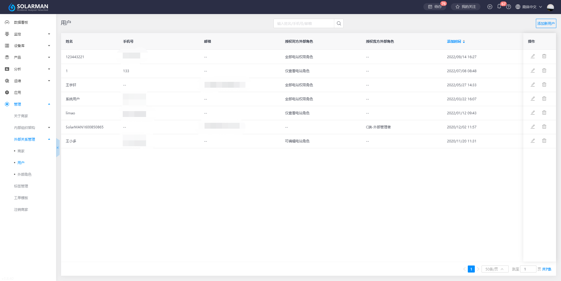 通过【用户】模块中汇总通过外部关系所创建的用户信息,也可在该页面添加新用户、编辑和删除用户等功能操作,满足您对外部客户的账号添加和管理。