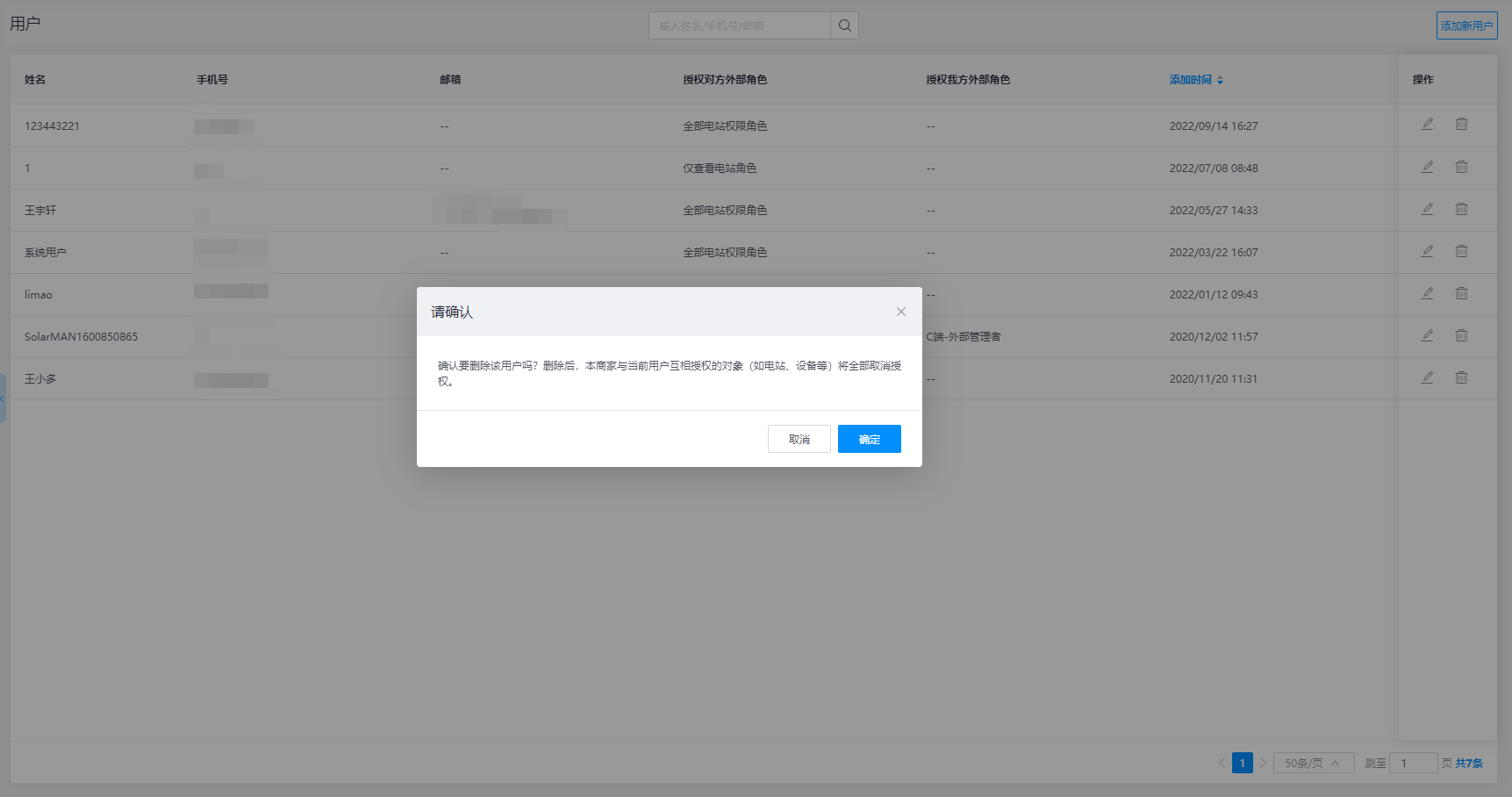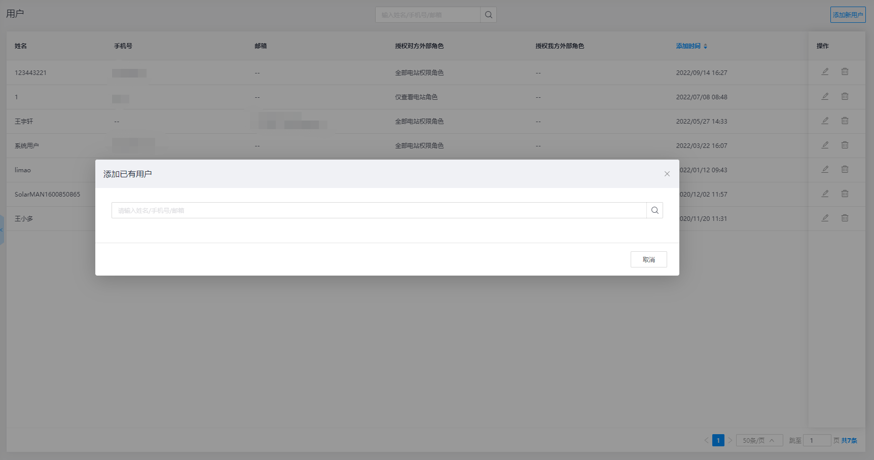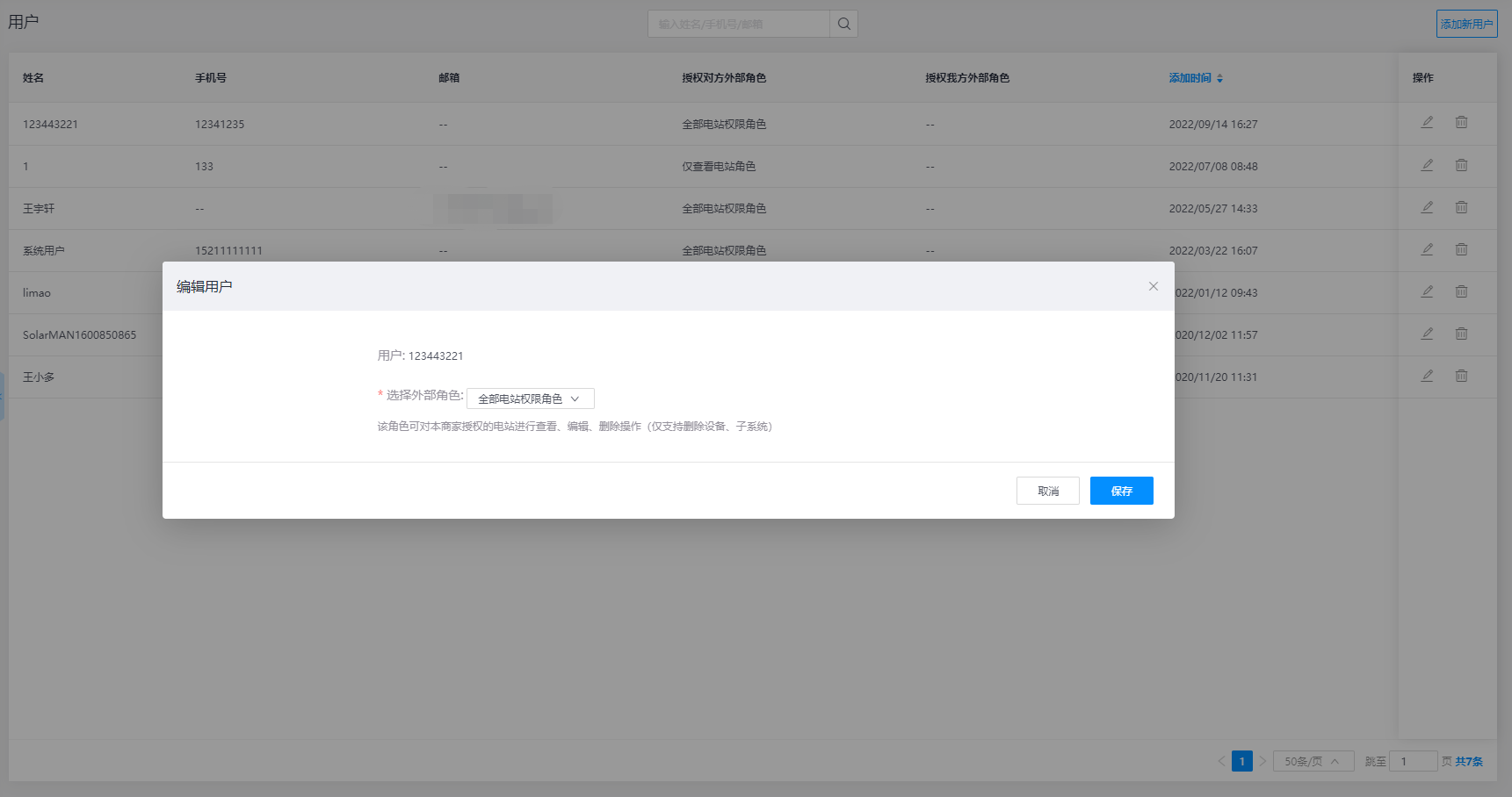 - 编辑: 若需要对外部用户权限进行修改时,可选择点击用户列表操作栏中的【编辑】按钮,对该用户的数据及功能权限进行修改,只包含您对该用户所授权的电站信息,没有进行授权的电站则无法查看