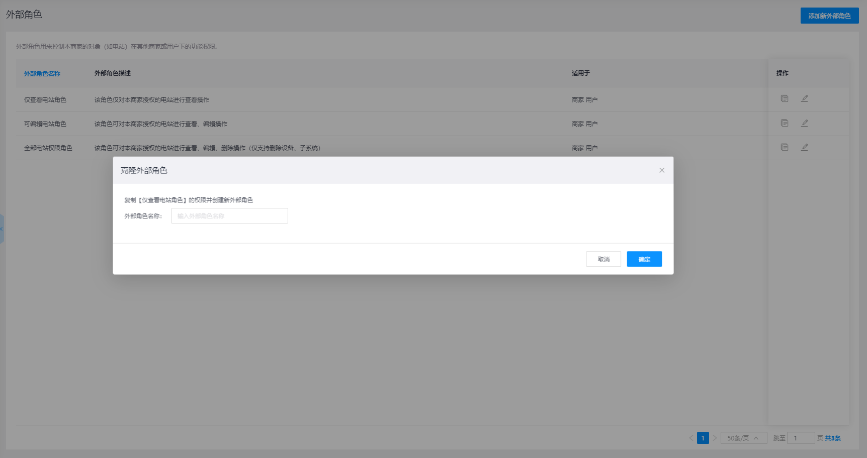 - 克隆外部角色:可在外部角色列表下选择对应的外部角色信息,然后点击操作栏【克隆】按钮,显示对应弹窗,在窗口中修改外部角色名称后可对该外部角色的功能权限进行克隆操作