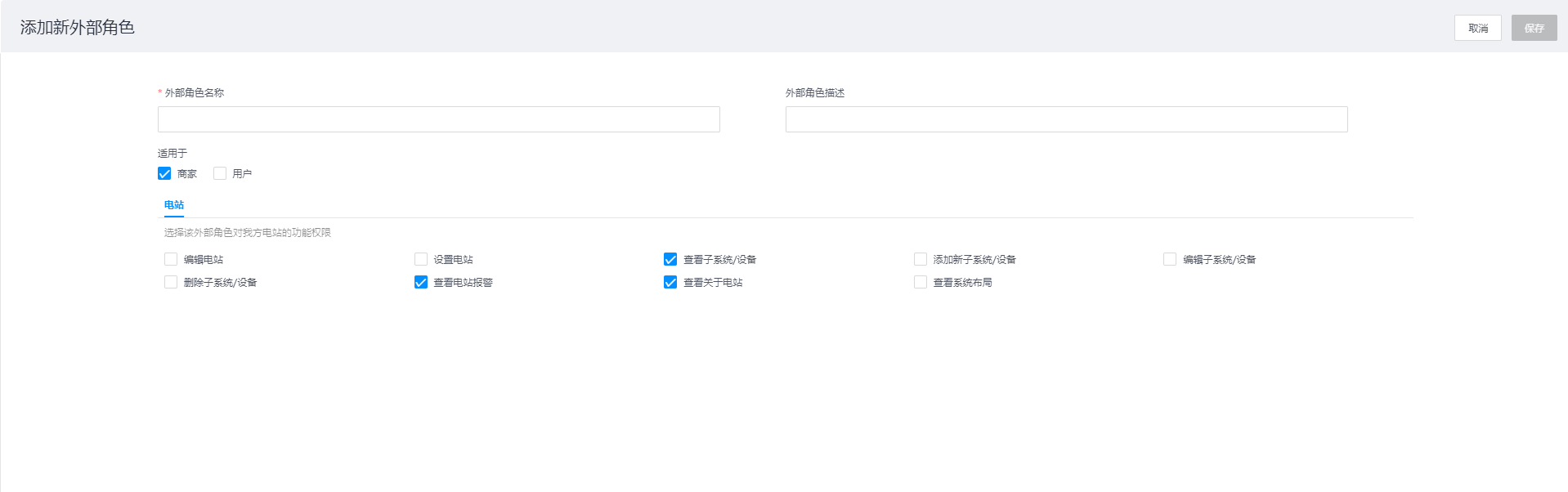 - 添加新外部角色: 选择点击外部角色页面右上角【添加新外部角色】按钮,跳转对应页面,您可在该页面添加外部角色名称、外部角色描述、适用于账号类型及权限配置完成外部角色添加,如图所示: