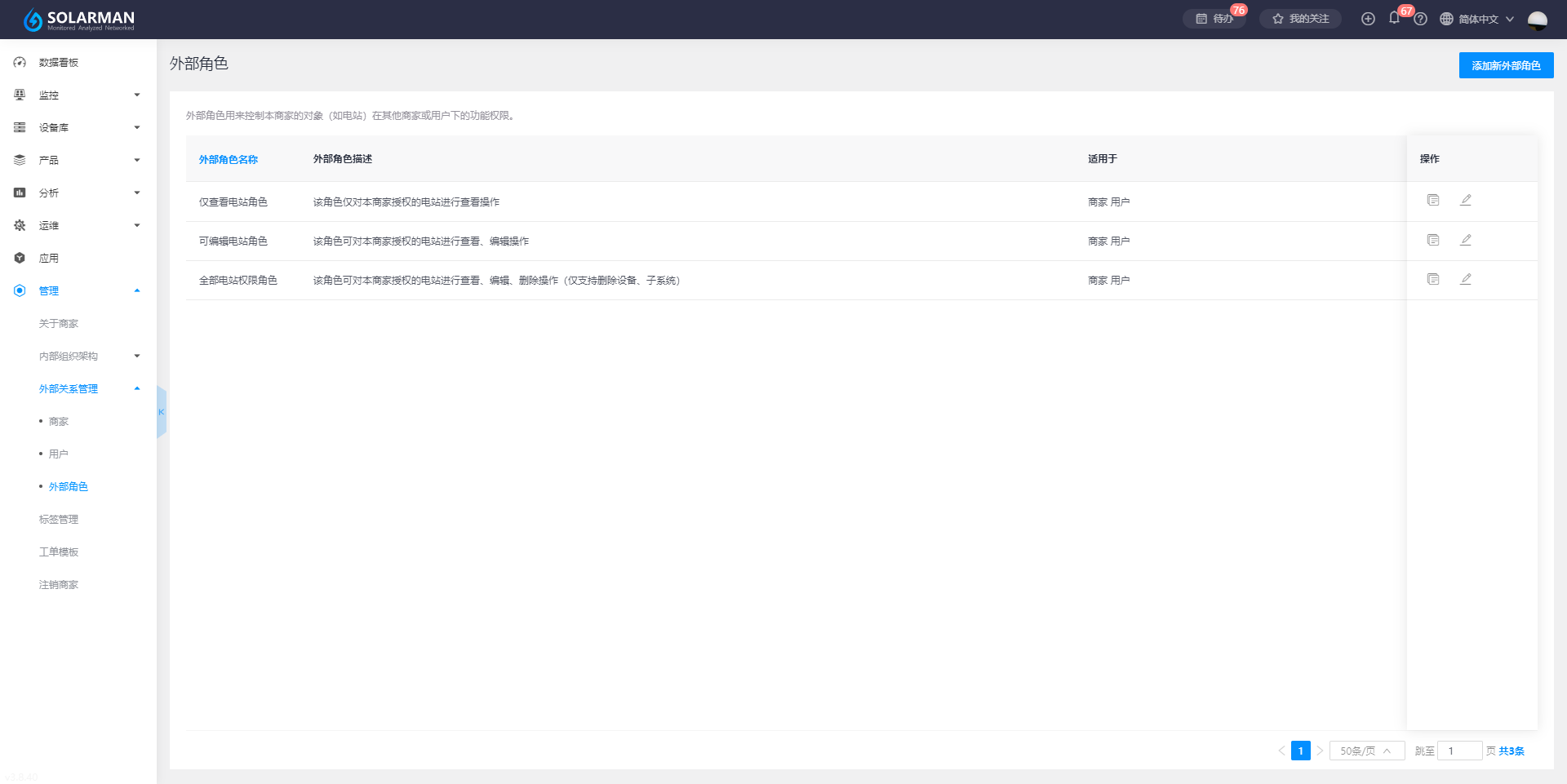 外部关系管理中的账号功能权限同样以角色为基础,通过划分不同的外部角色分配不同的功能权限,并在添加成员时选择对应的外部角色,实现外部用户的功能权限的区分和隔离,系统预设三种角色,您可跟根据需要进行修改和添加新角色。