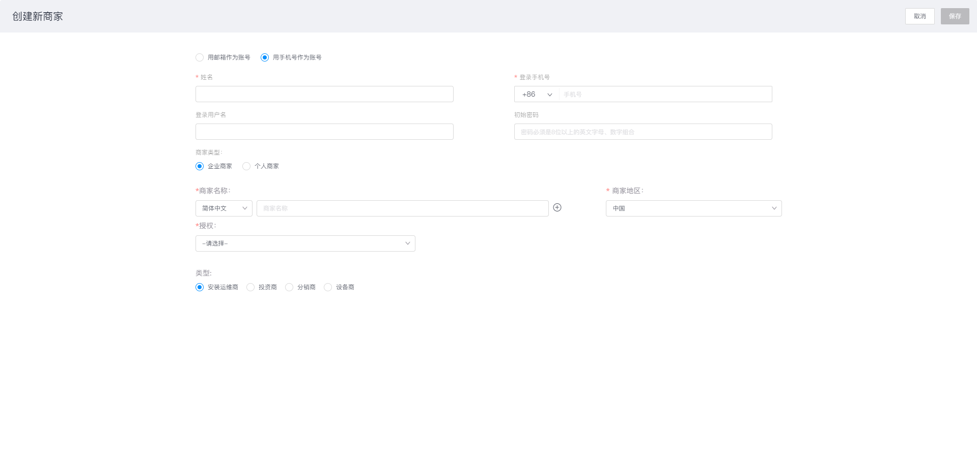 - 创建新商家:选择创建新商家时,页面跳转对应页面,您需要根据提示完善新商家的账号信息,然后点击【保存】完成外部商家账号的创建2.添加已有商家:选择添加已有商家时,页面中显示对应弹窗,在窗口中可查询已有商家的账号信息,输入商家名称后系统会模糊查询对应的商家账号,找到商家后设置对应权限从而完成添加