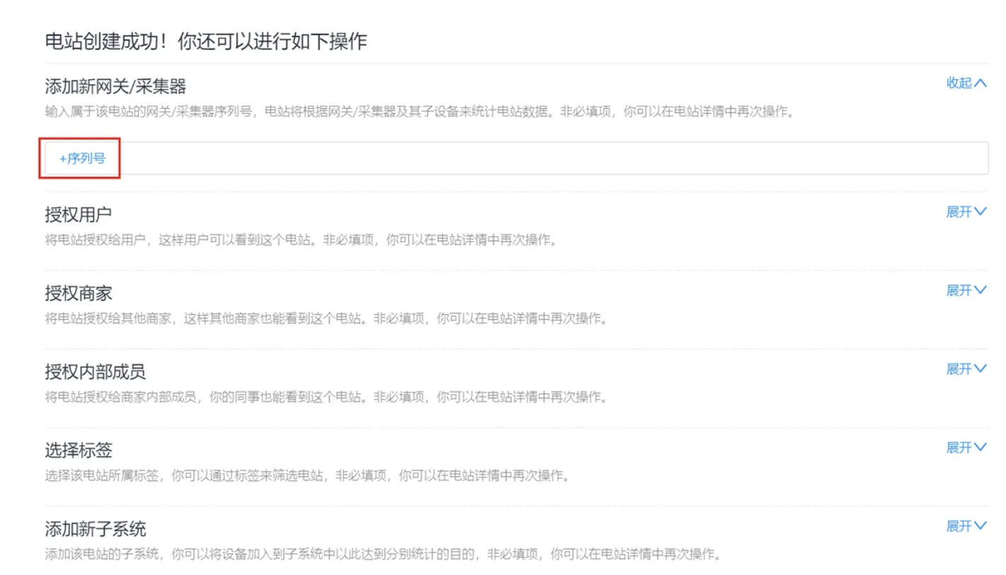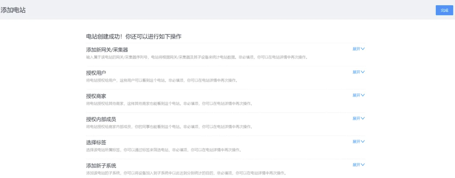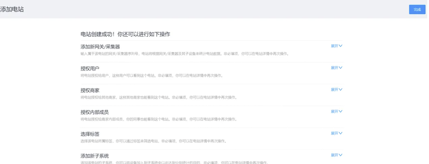 完善电站信息后,请点击页面右上角的【保存】按钮完成创建,您可在电站创建成功页面直接添加设备以及授权用户。