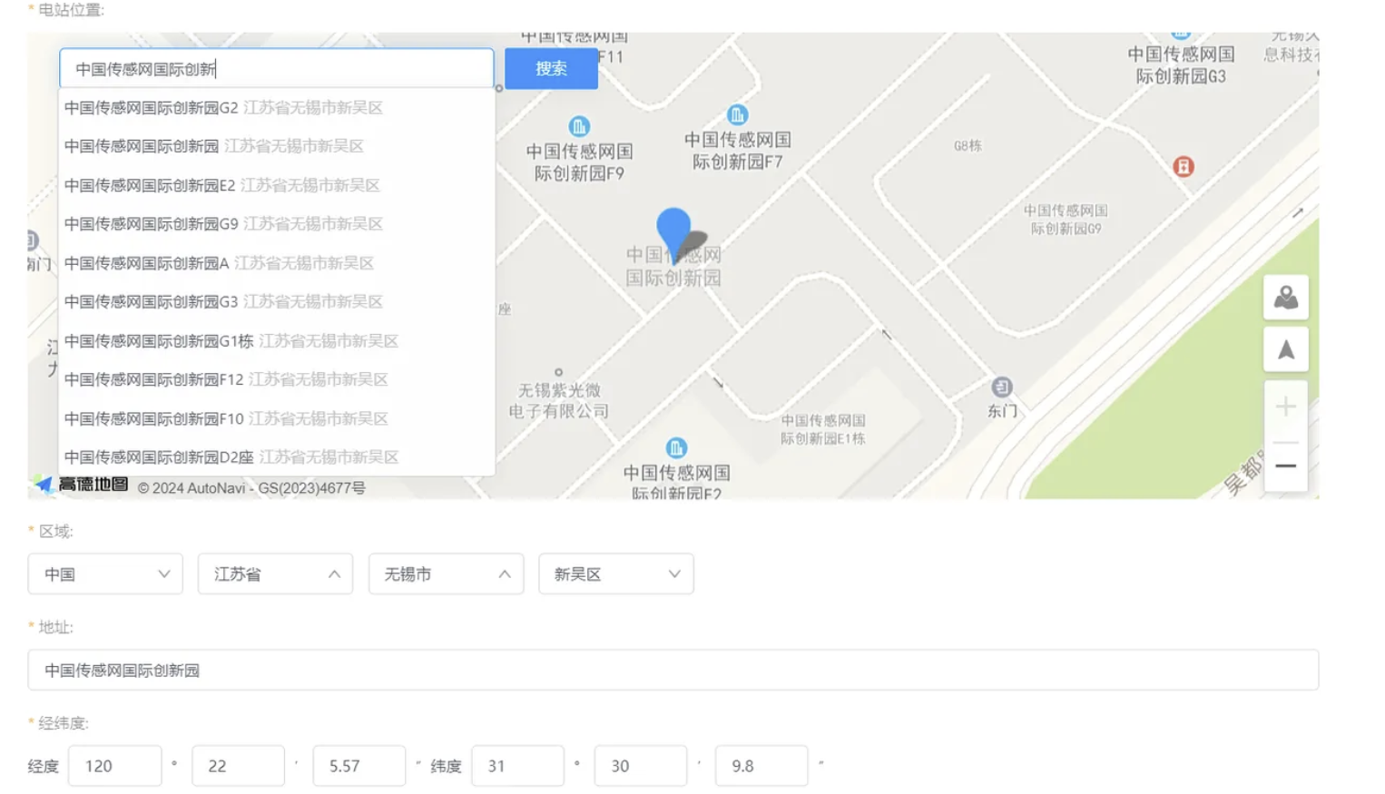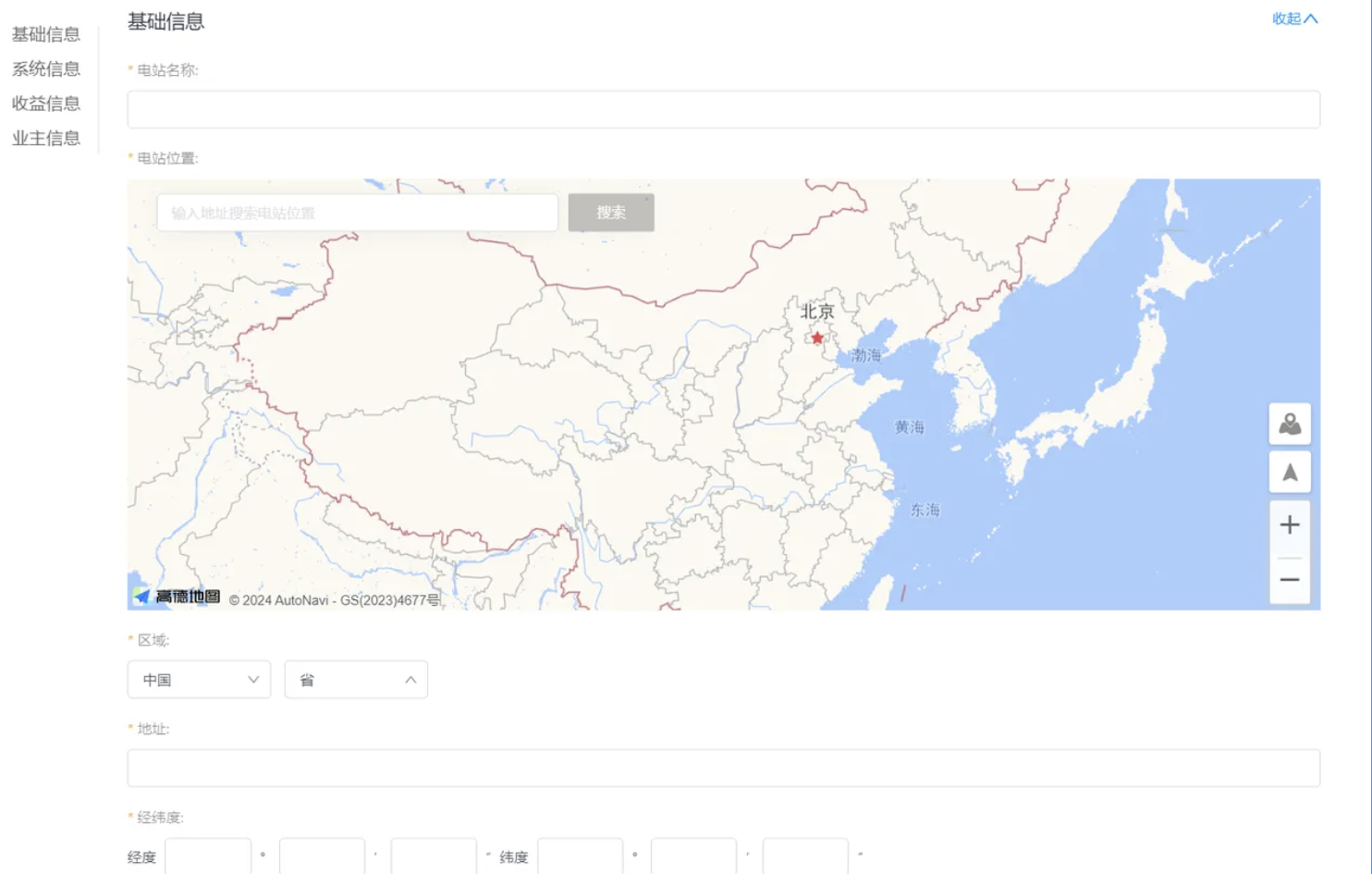 在“电站位置”处,您可以查找电站所在位置或直接点击地图中的电站位置,系统会为您自动匹配其余信息,您只需填写电站名称和详细地址,或者您也可以逐个输入相关信息进行完善。