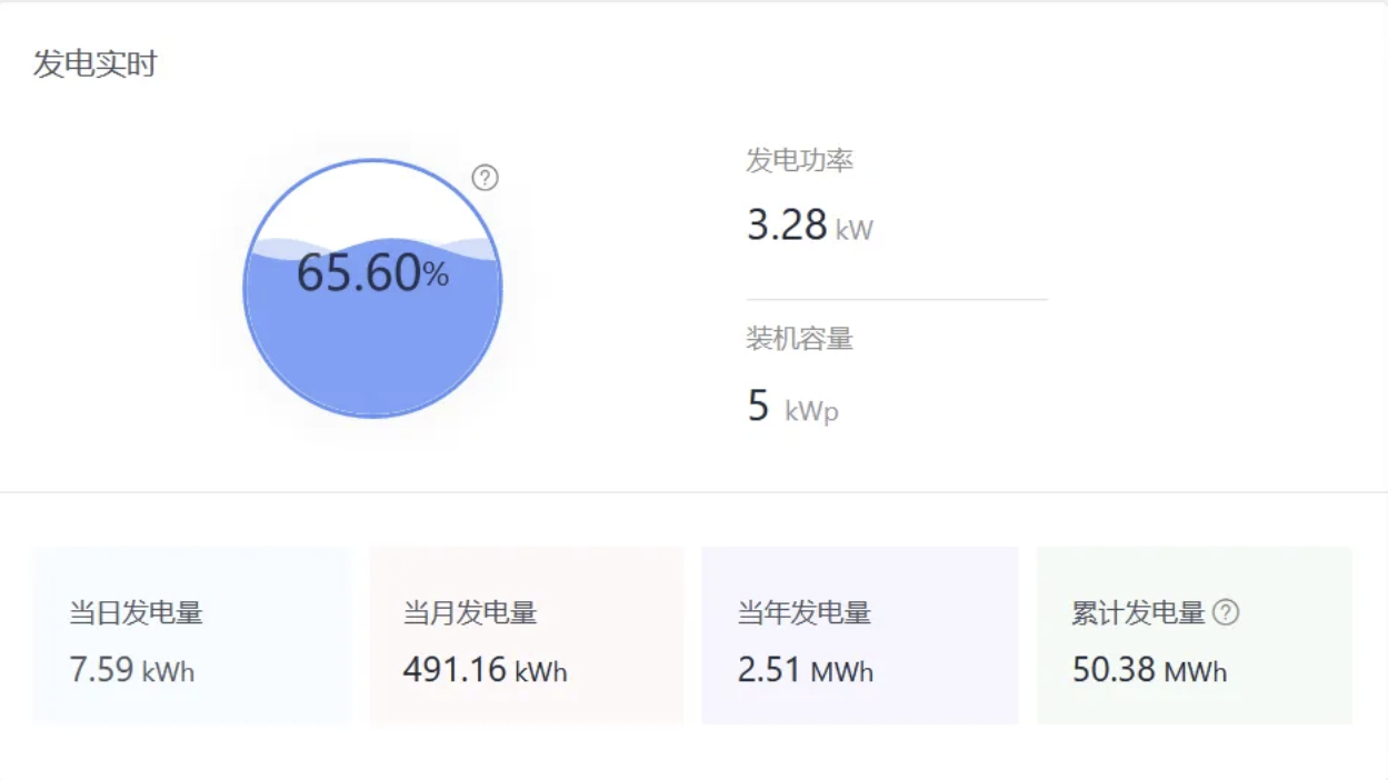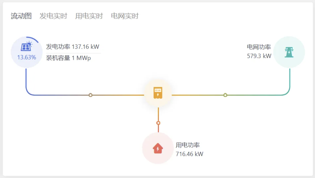 光伏+电网+用电: 在发电数据的基础上展示用电和电网数据,如用电功率、用电量、电网功率、并网量和购电量