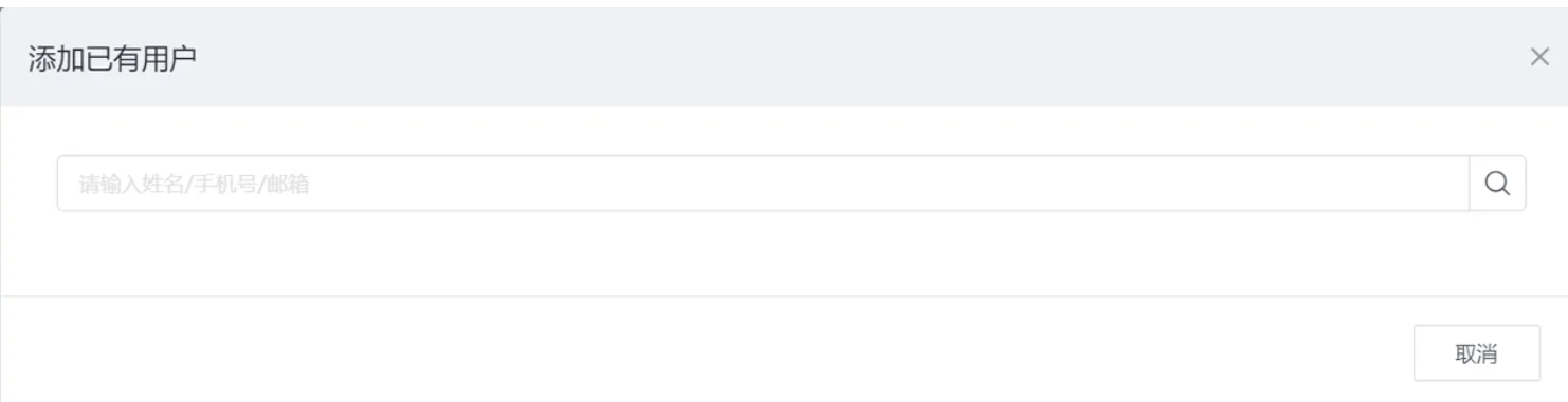 请点击添加已有用户,在弹出的对话框中输入用户的相关信息(姓名、邮箱、手机号等)搜索并选择目标用户。