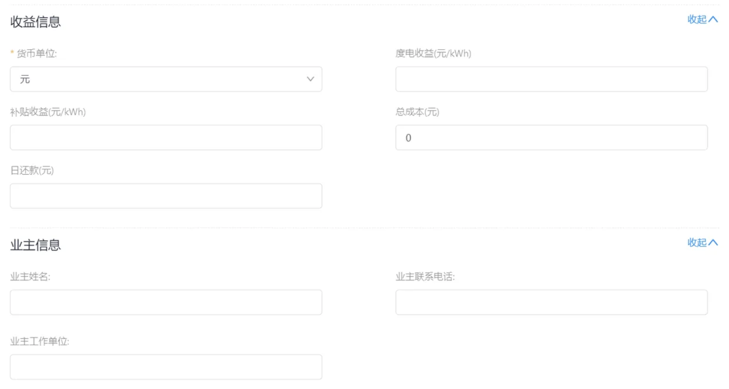 请您根据本商家的实际情况完善其余信息,您输入的信息越完善越能更好的管理电站,其中收益信息中的货币单位,将会影响到系统的收益计算,请您确认后填写。