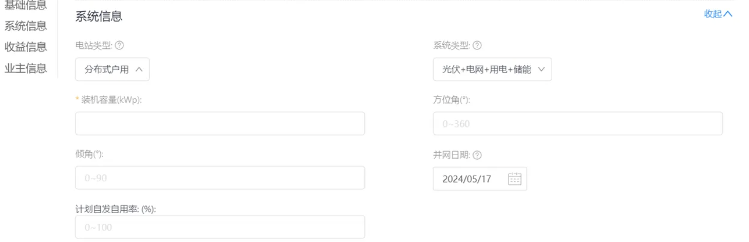 请按照本商家要创建的电站真实情况,完善电站系统信息:电站类型、系统类型、装机容量、方位角、倾角、并网日期。