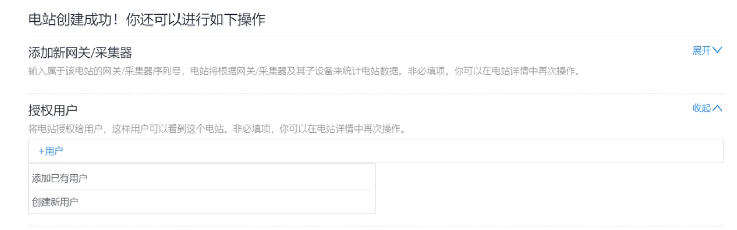 请您点击“授权用户”一栏的 “展开”,并点击“+”按钮,您可以选择添加已有用户和创建新用户从而完成该电站授权,便于终端用户的查看。