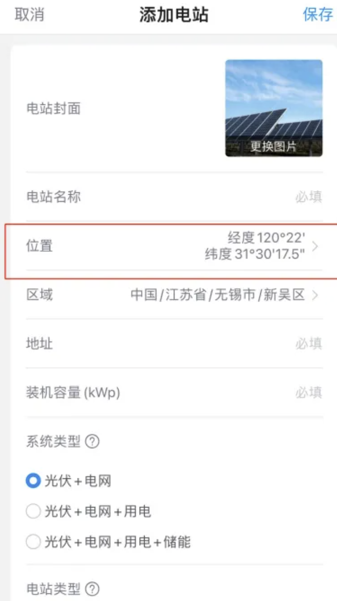 完善基础信息时,若您不在电站附近创建,可以点击“位置”栏,查找电站位置,系统会为您自动匹配其余信息,此外您还需要填写电站的名称及地址(50字内);或者您也可以逐个输入相关信息进行完善。