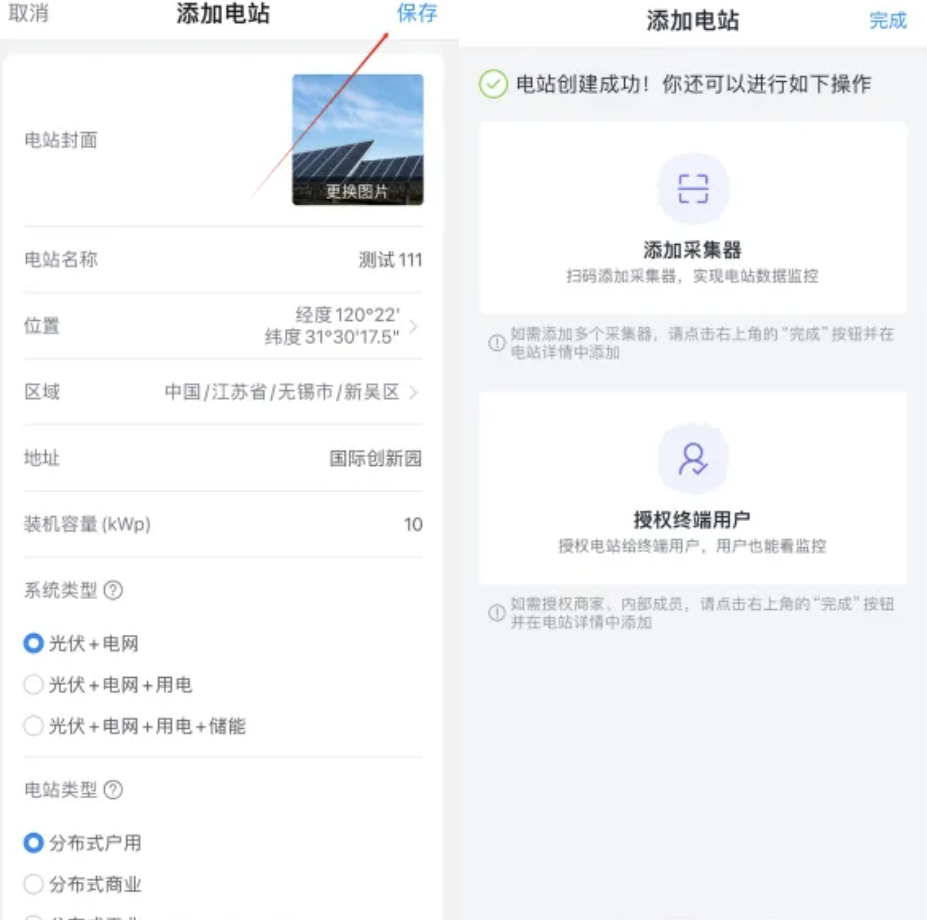 7.完善电站信息后,请点击页面右上角的【保存】按钮完成创建,您可在电站创建成功页面直接添加设备以及授权用户。