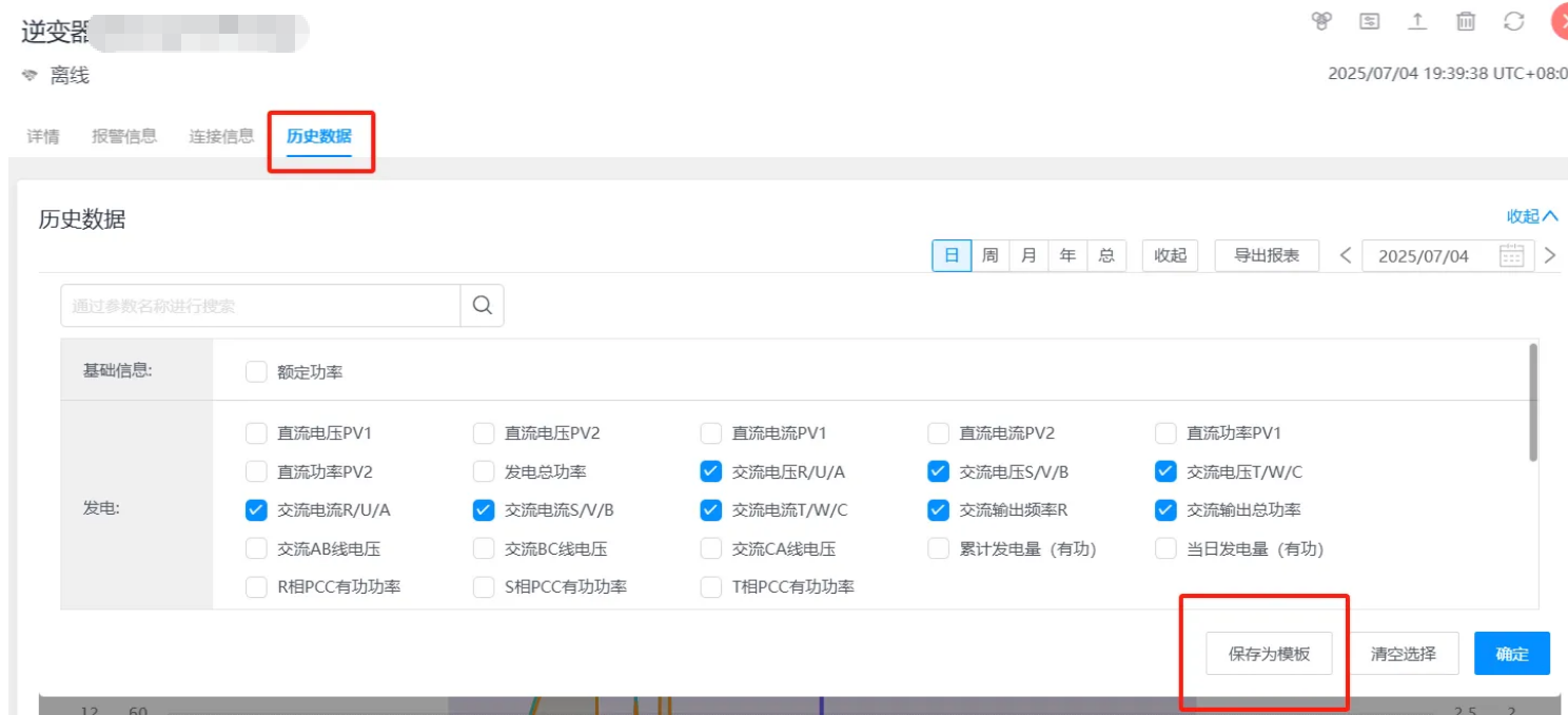 在逆变器历史界面,参数选择,选择想要的参数,点击保存为模版