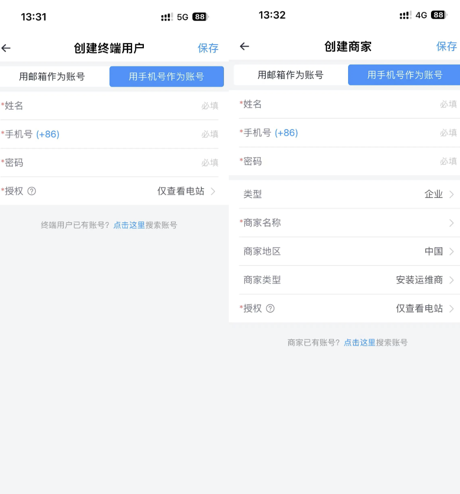 根据对方的账号类型进行授权(如与您共同管理/查看电站的人员使用的是“小麦智电”,则选择“+点击这里授权终端用户”;如与您共同管理/查看电站的人员使用的是“小麦商家”,则选择“+点击这里授权商家”/“+授权内部成员”。)