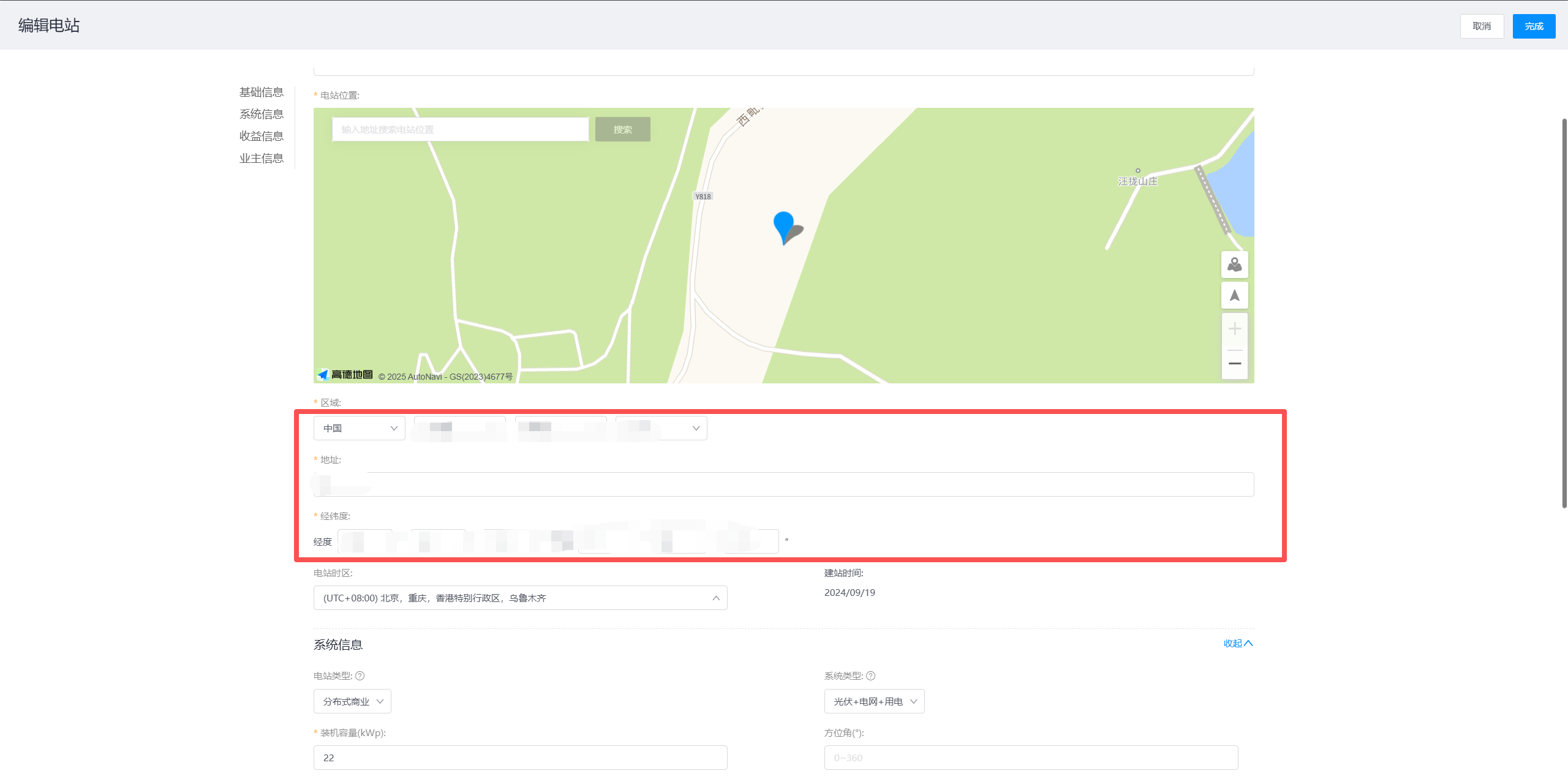 如果电站位置不正确,天气数据也将与当地不匹配。请准确填写电站的行政区域和经纬度,准确的城市和地区。
