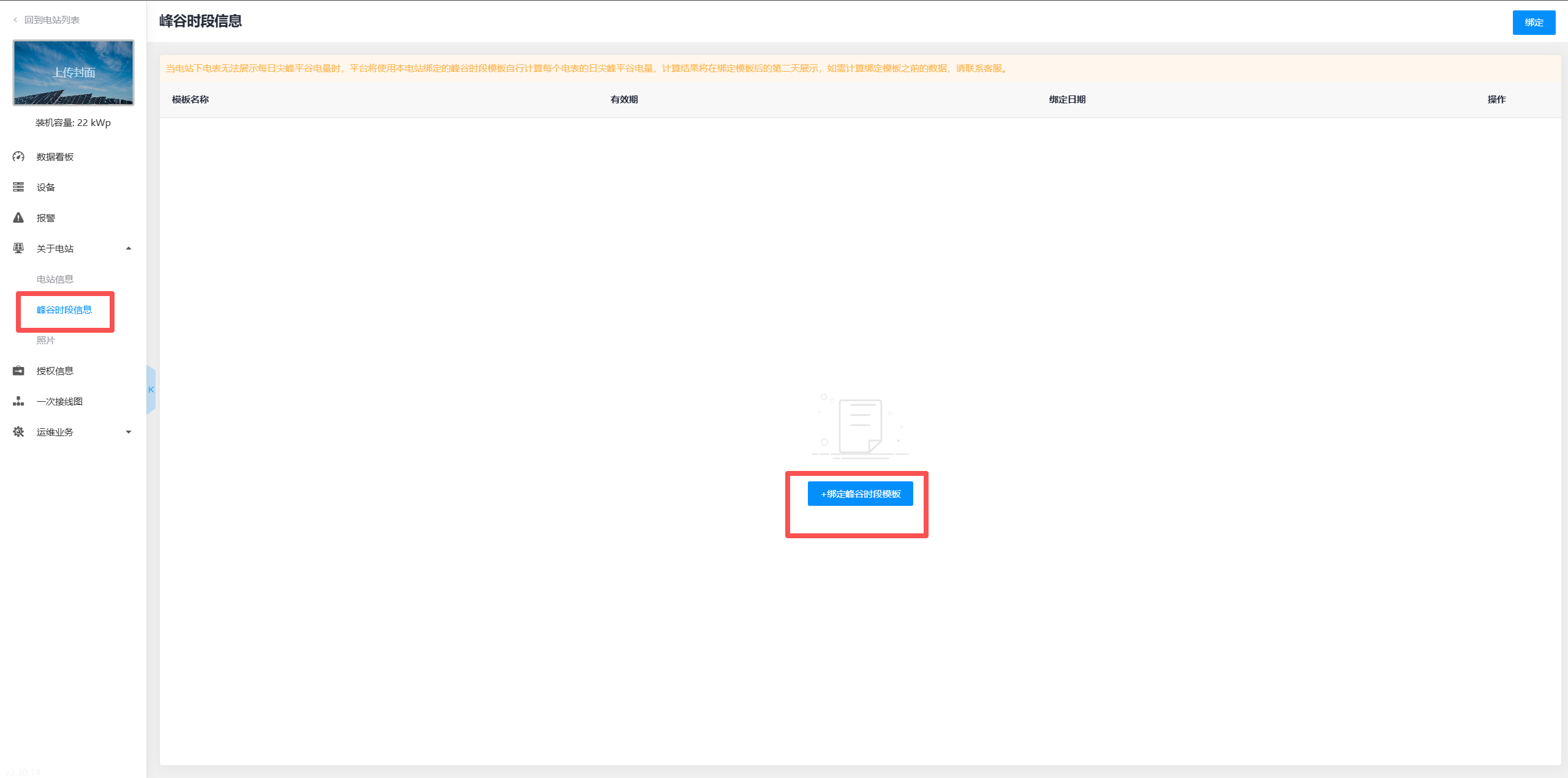 创建峰谷时段模板完成后,在电站详情-电站信息-峰谷时段信息卡片,可以通过点击“+绑定峰谷时段模板”,绑定峰谷时段模板