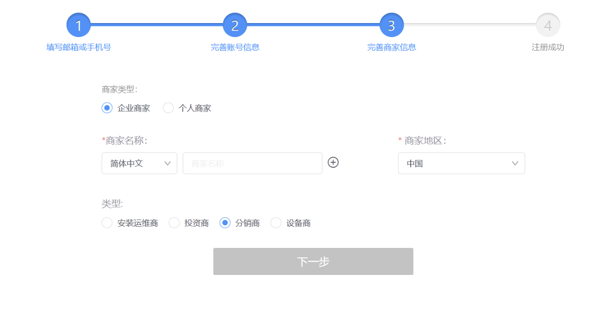 请按照提示,选择商家类型、商家地区、商家服务类型并添加商家名称。