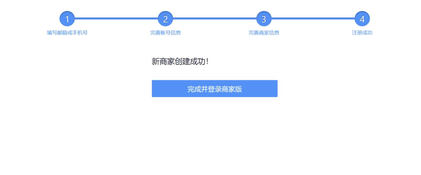 完善账户信息完毕后,流程到注册成功页面,点击“完成并登录商家版”按钮,跳转回登录界面,正确输入刚注册的账号密码登录即可。
