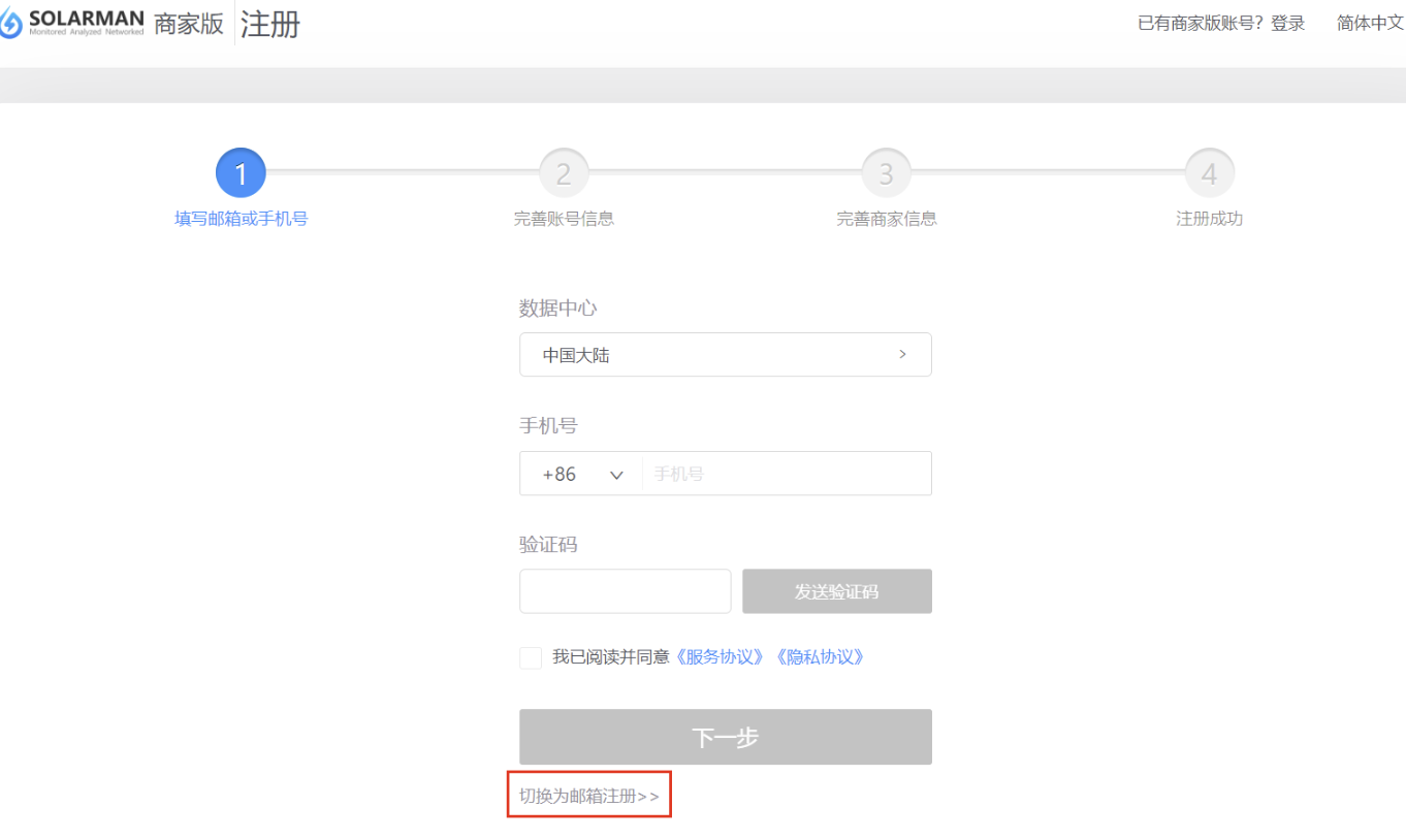 请您按照提示,确认该账户注册地域的默认选项,若不同地域时可选择点击进行切换,然后正确输入手机号或邮箱账号并进行验证,小麦商家版同时支持手机和邮箱进行账号注册,可点击下图所示位置相互切换。