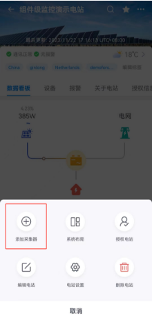 完成线上电站数据的创建后,则需要为您的电站添加采集器完成设备接入。采集器可以采集光伏设备的运行数据,并上传至服务器,届时您就可以通过小麦商家版APP应用查看服务器上的电站数据。通过这些数据,您就可以一目了然的掌握光伏电站的运行情况和预计收益情况,并及时判断电站是否处于正常运行状态,从而尽可能避免由于设备故障等原因造成的财产损失。