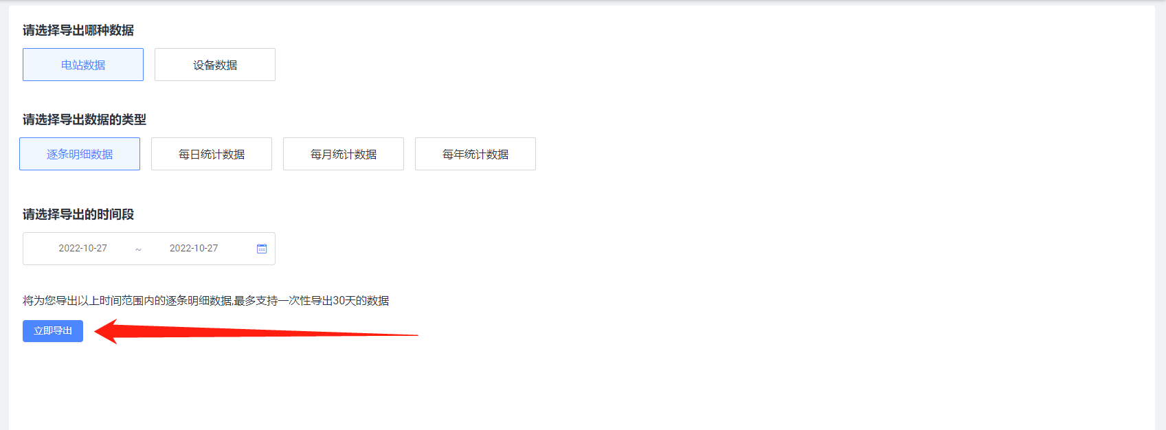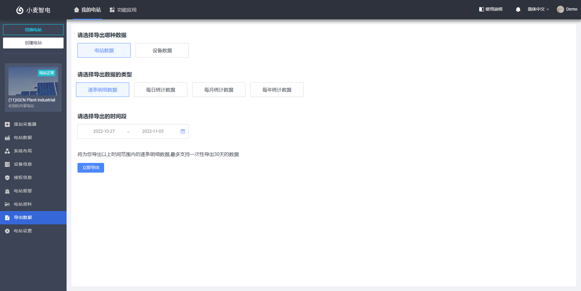 在导出数据模块,可支持导出该电站的汇总数据统计,其中包含"电站数据“和”设备数据“,然后选择导出数据类型和时间段,便可为您导出以上时间范围内的数据统计,有利于进行电站数据分析及管理。