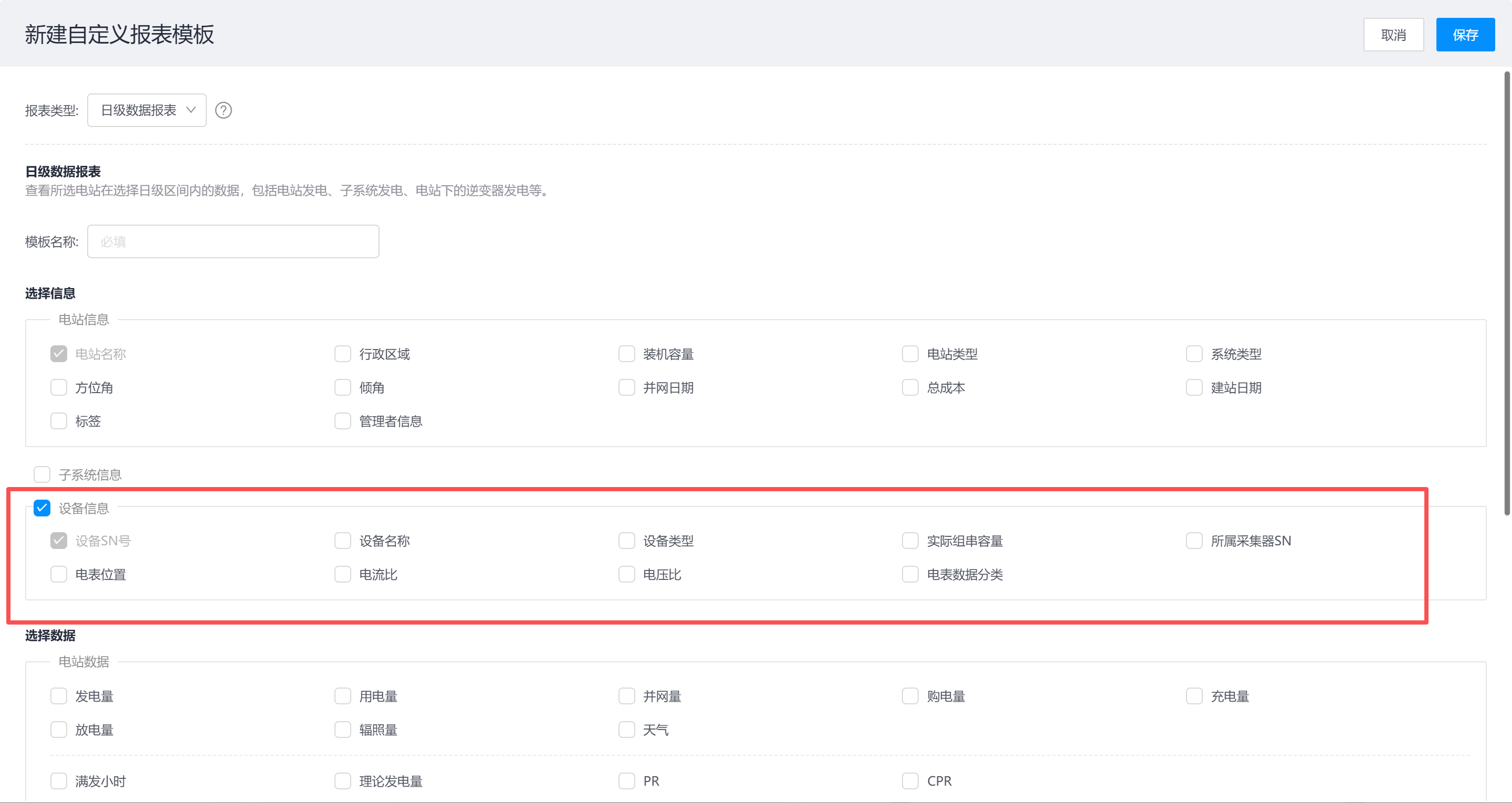 在创建报表模版时选择信息里点选设备信息,在选择数据里就可以选择需要导出的设备参数