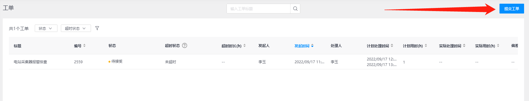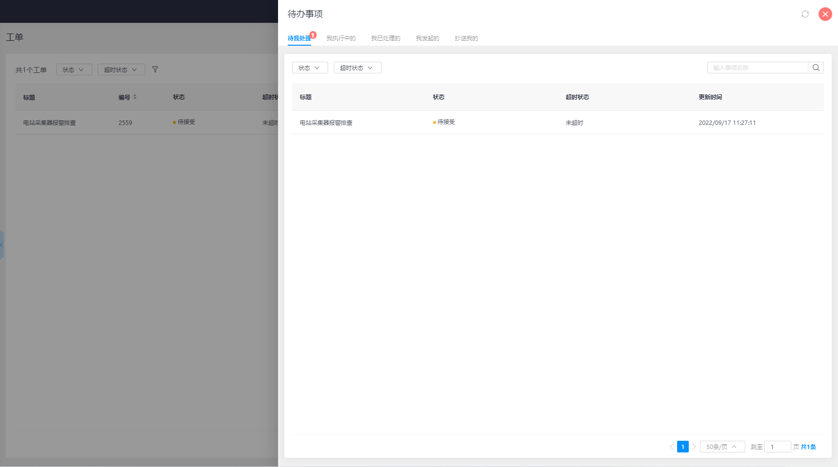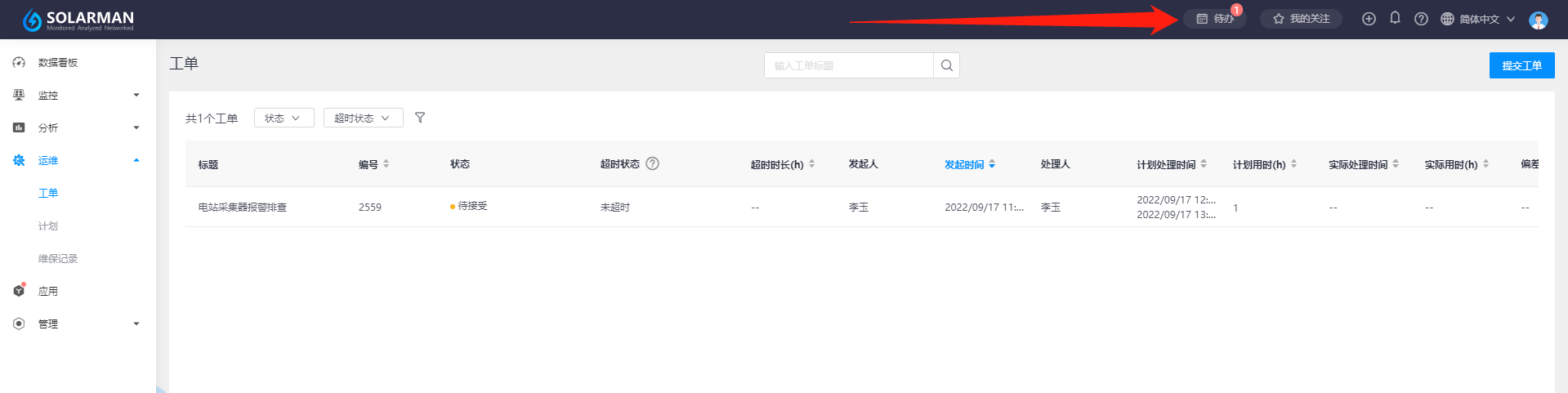 当您提交工单任务后,系统会发送通知给处理人,处理人登录平台后,可在【待办任务】处看到工单任务信息提醒,处理人可看到有一个“待接受”状态的工单等待接受。