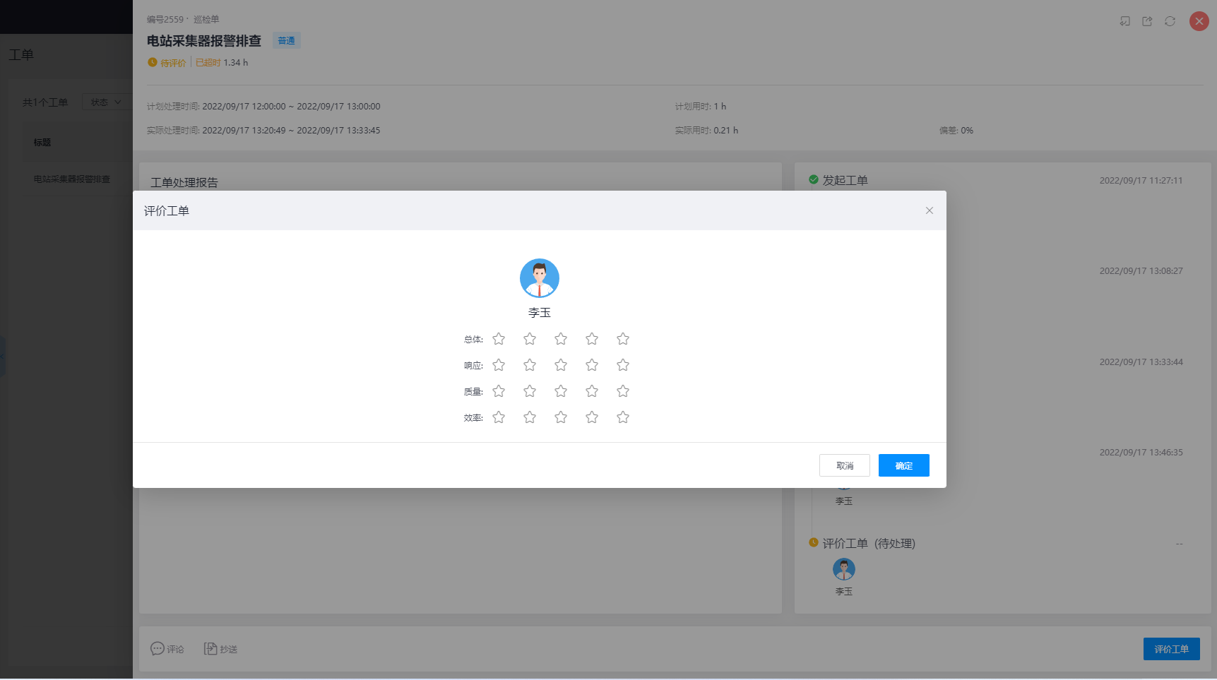 点击该工单任务,进入工单详情,评价人可查看工单处理报告内容,工单实际处理时间和实际结束时间,工单的具体流程情况等,以此判断该给本次工单处理人员打分评价。