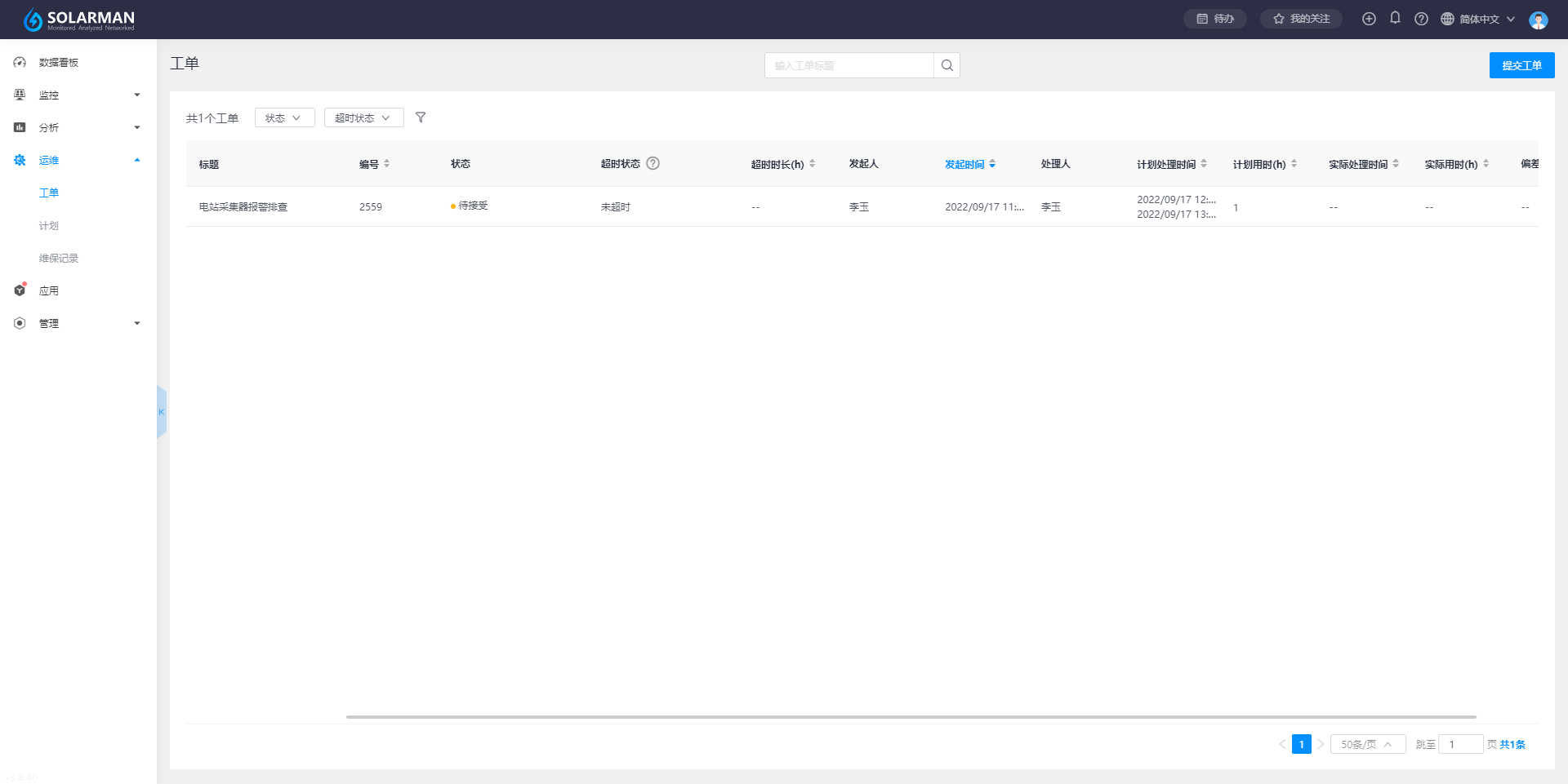 【工单】是主要用于流程化管理模块,通过工单可以将线下的工作流转到线上,更方便运维流程中的执行、工作的追溯等,以及针对工单任务数据的汇总及管理,方便您快速安排处理电站异常状况,避免影响正常发电效率。