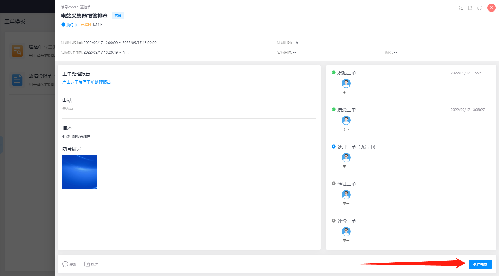 完成工单报告后,点击【处理完成】,即可将工单流转到下一个节点,即验证工单,此时工单的状态转为“待验证”
