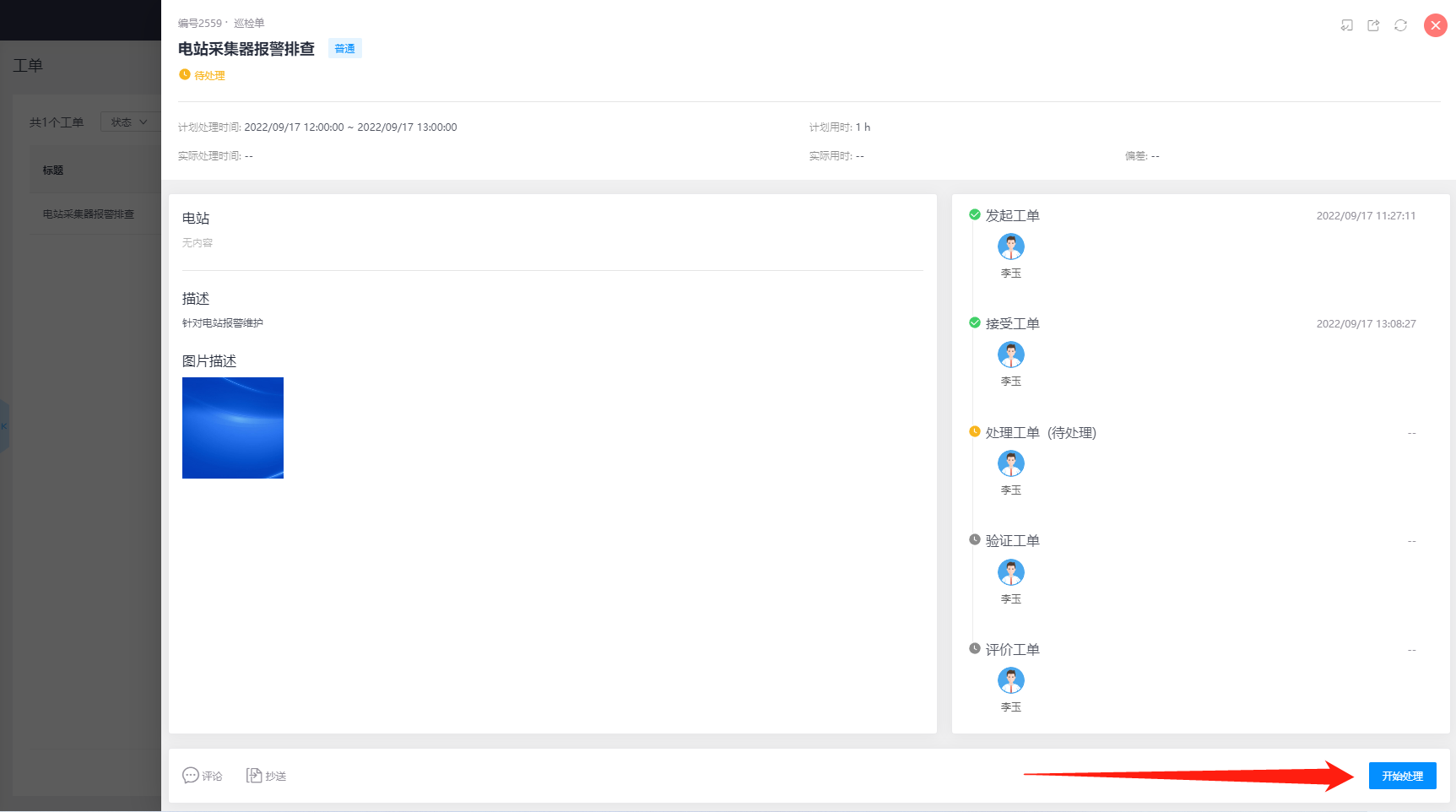 点击该工单任务,可查看工单详情,如已开始处理工单时,则点击【开始处理】