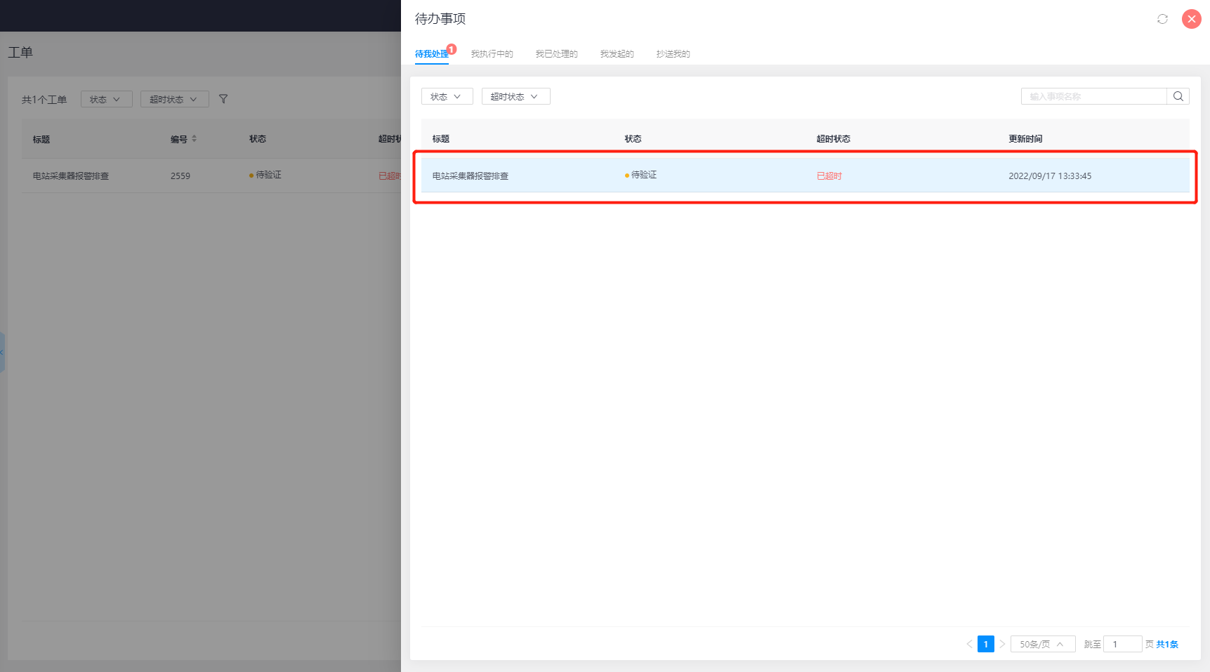 工单验证人也会收到工单待验证通知,进入平台后,同样在【待办任务】界面也会看到红点提示,点开待办可看到有1个工单待验证。