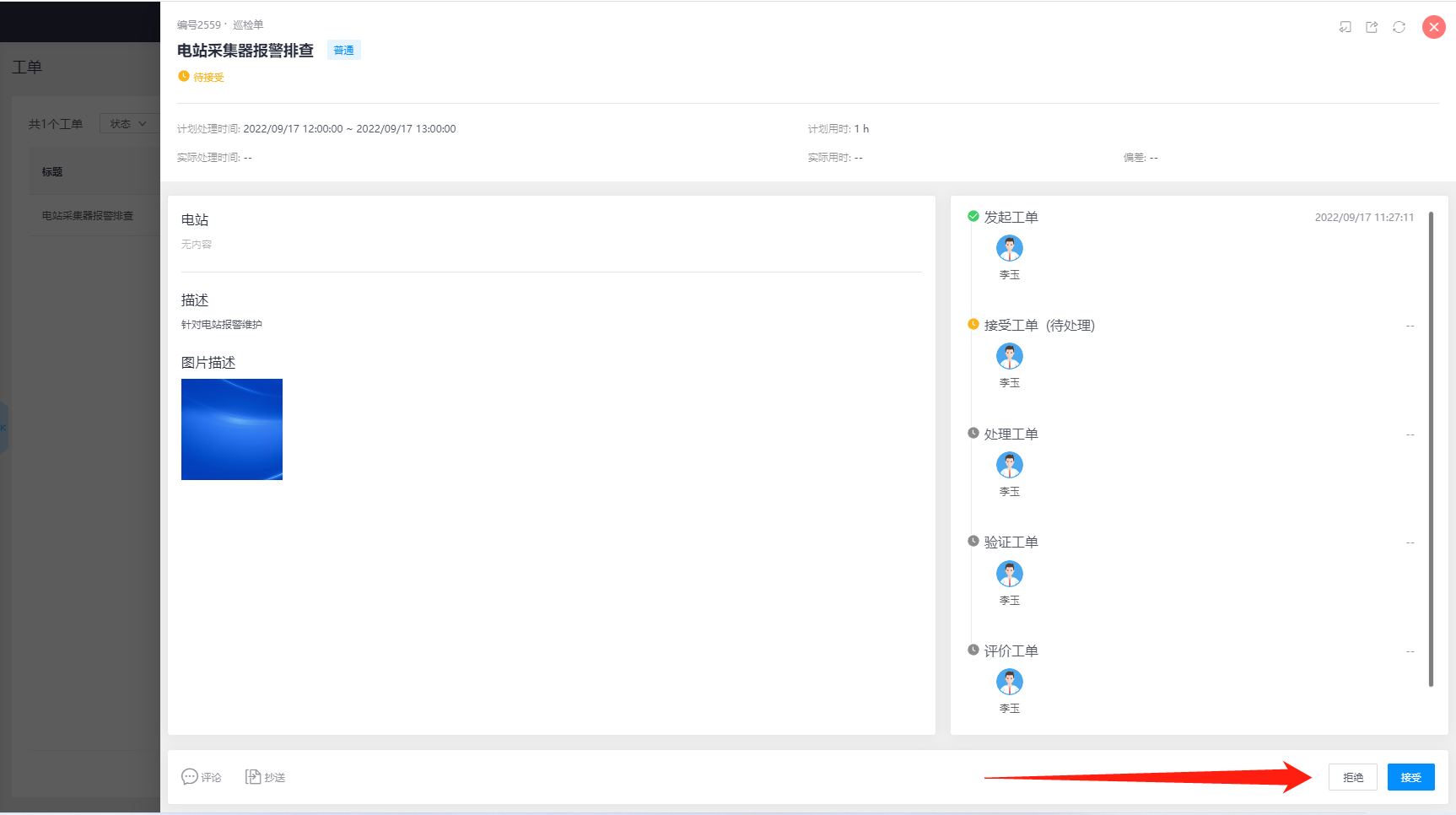 点击该工单,可查看工单详情,在工单详情可浏览工单的描述,点击【拒绝】则拒绝工单,工单将会回到发起人。
