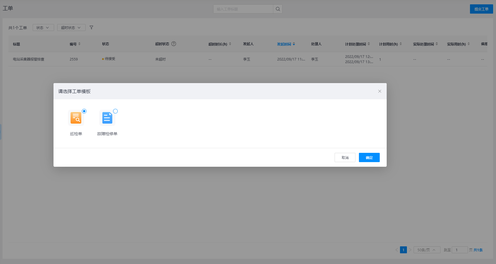 - 提交工单: 点击右上角【提交工单】按钮,可进行发起工单任务指派人员线下运维的流程操作,首先需要选择对应的工单模板,然后填写工单任务信息及指派对应人员处理,可详见【提交工单步骤】