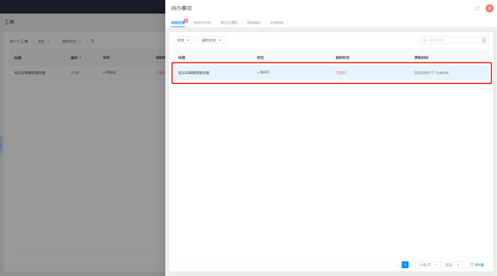 工单任务变为待评价状态时,工单评价人也会收到工单待评价通知,进入平台后,在【待办任务】界面也会看到红点提示,点开待办可看到有1个工单待评价。