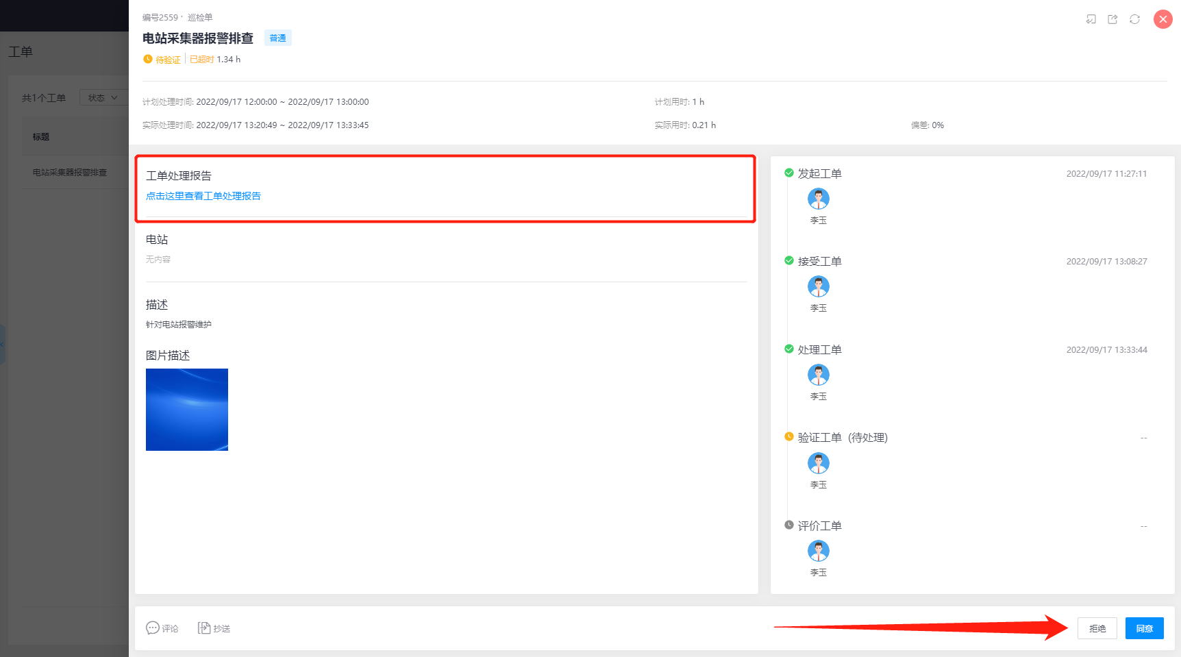点击该工单任务,进入工单详情,验证人可查看工单处理报告内容,以判断工单处理人是否按照要求完成了工单,点击【拒绝】按钮,工单将返回上一节点即“处理工单”,点击【同意】按钮,工单将进入下一节点即“评价工单”,此时工单状态显示“待评价”
