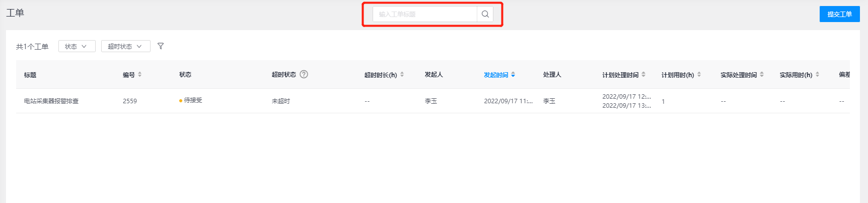 工单查询: 可输入工单标题进行查询工单任务数据,系统会根据您输入的工单标题进行模糊查询从而快速搜索对应工单任务数据信息,如图所示: