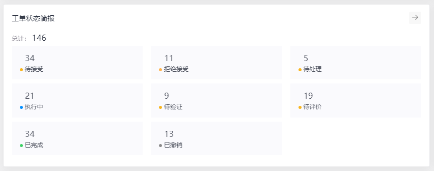 工单状态简报是将系统中全部工单任务通过当前所处状态进行汇总及展示,其中分为待接受、拒绝接受、待处理、执行中、待验证、待评价、已完成和已撤销等,您可以点击对应状态快速查看对应状态的数据列表筛选。