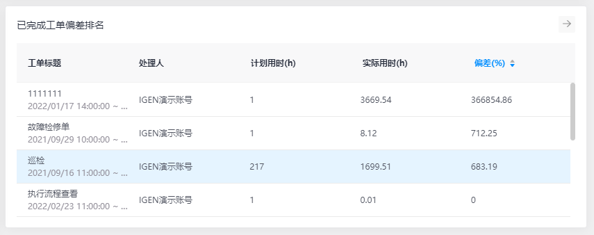 已完成工单偏差排名是汇总已完成工单任务状态的耗时偏差排名,主要是针对处理人的计划用时和实际用时之间的偏差进行分析排名,从而有效监控工单任务处理质量的对比。