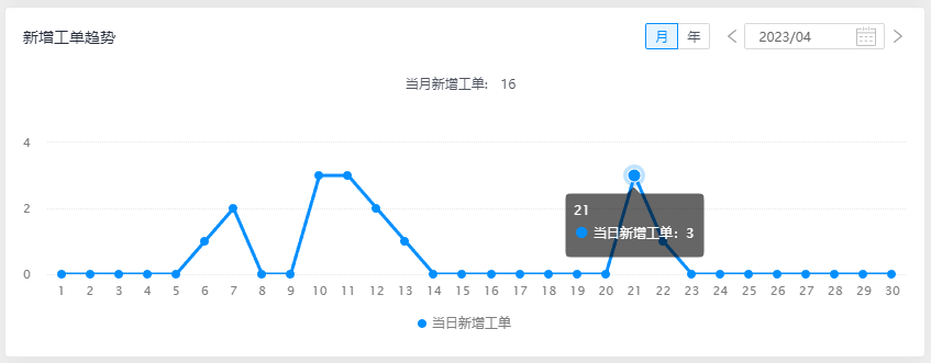 新增工单趋势是将系统近期的新增的工单任务数据进行汇总,通过数据图表的形式更加直观的展示给用户,可支持通过日期筛选从而查看不同时期的新增工单数量。