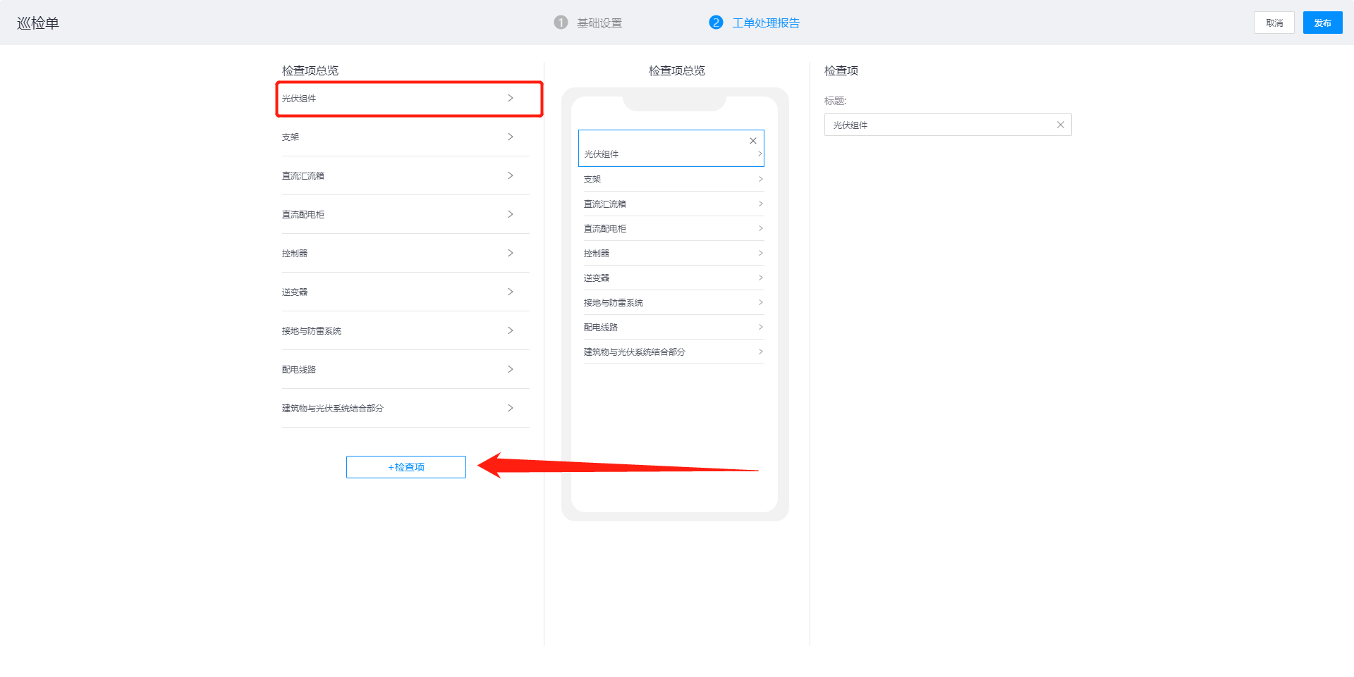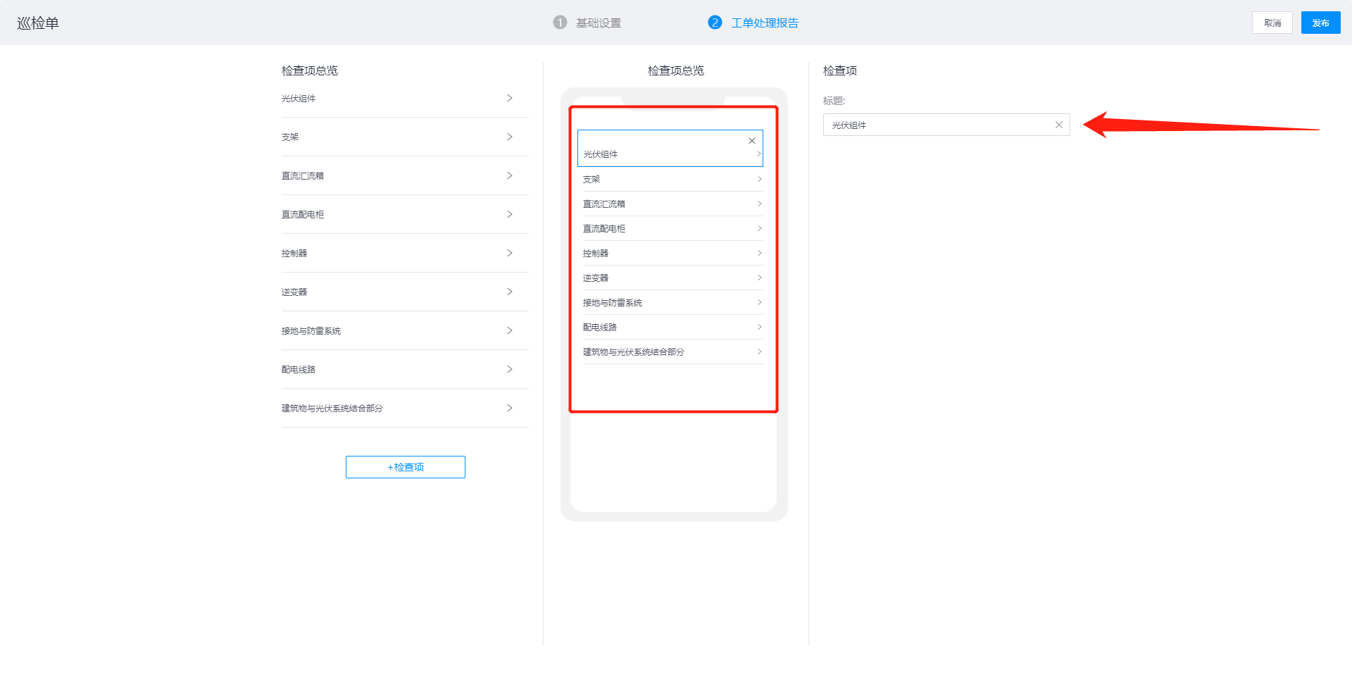 在检查项详情,可配置该检查项的具体表单内容,可点击中间的表单,修改表单的标题及相关配置信息,如点击图中红框表单,可修改表单的标题和内容