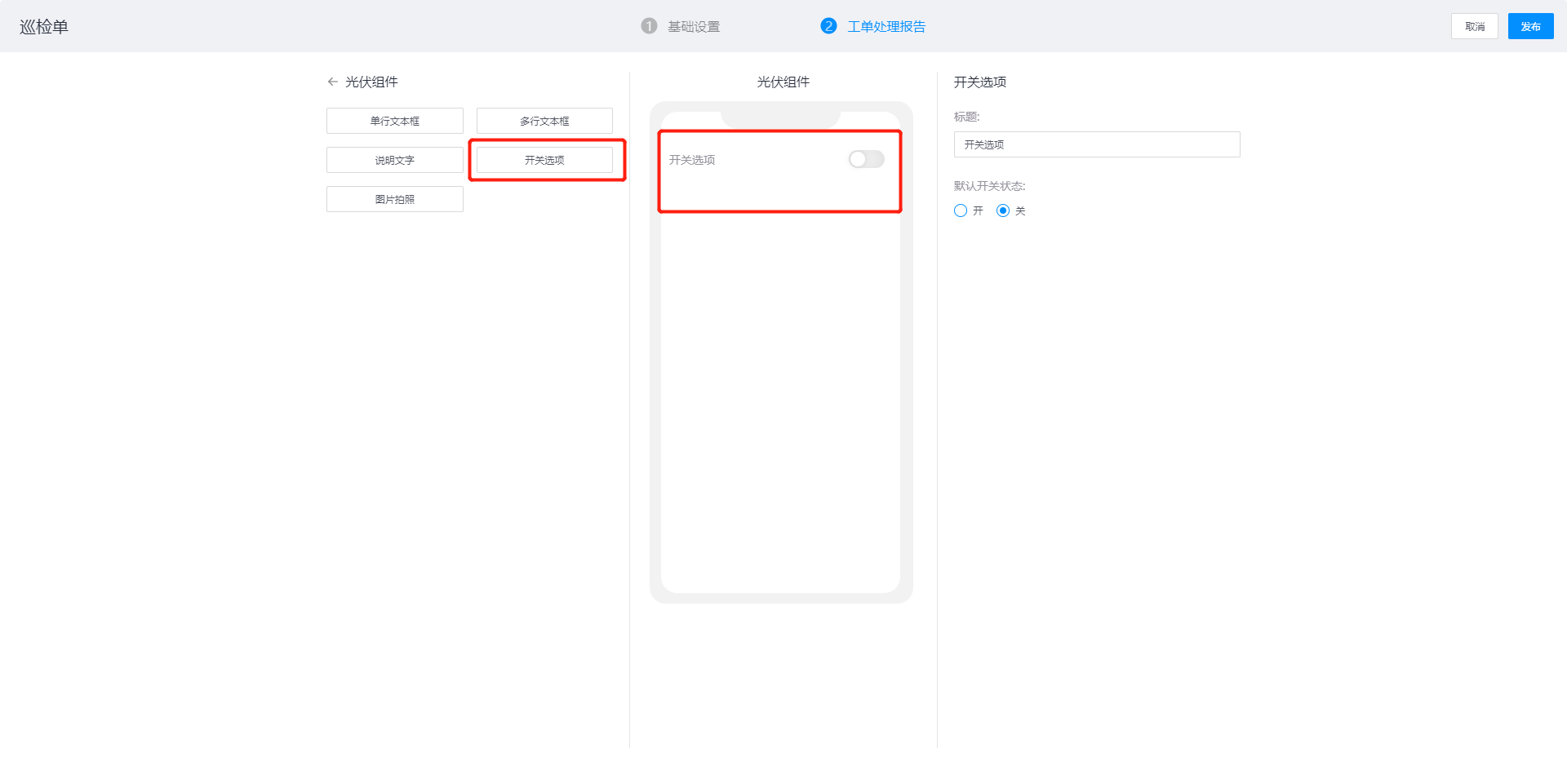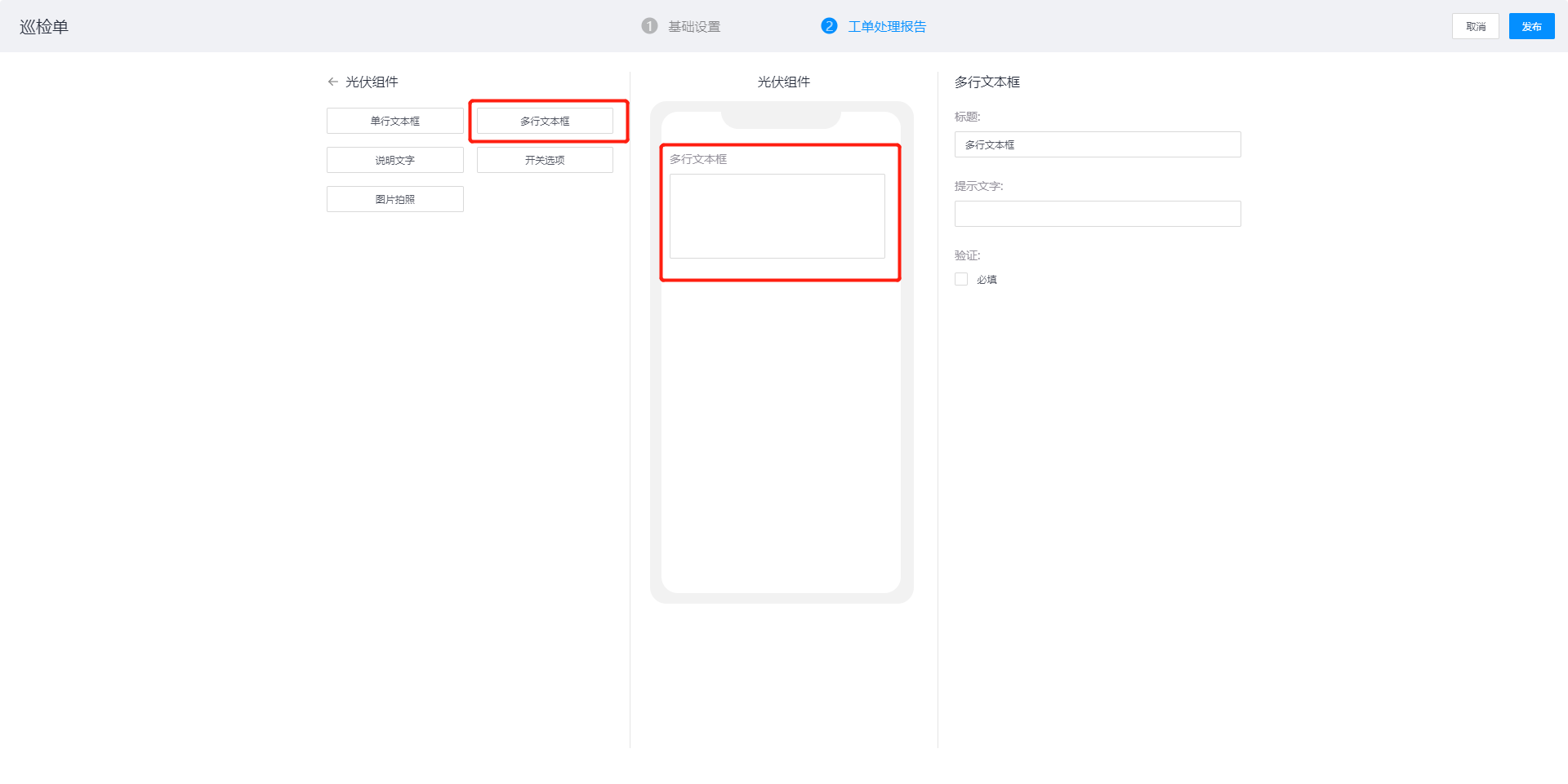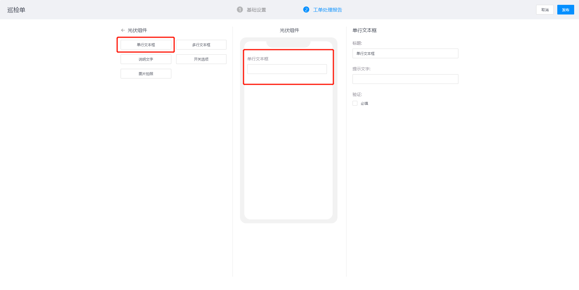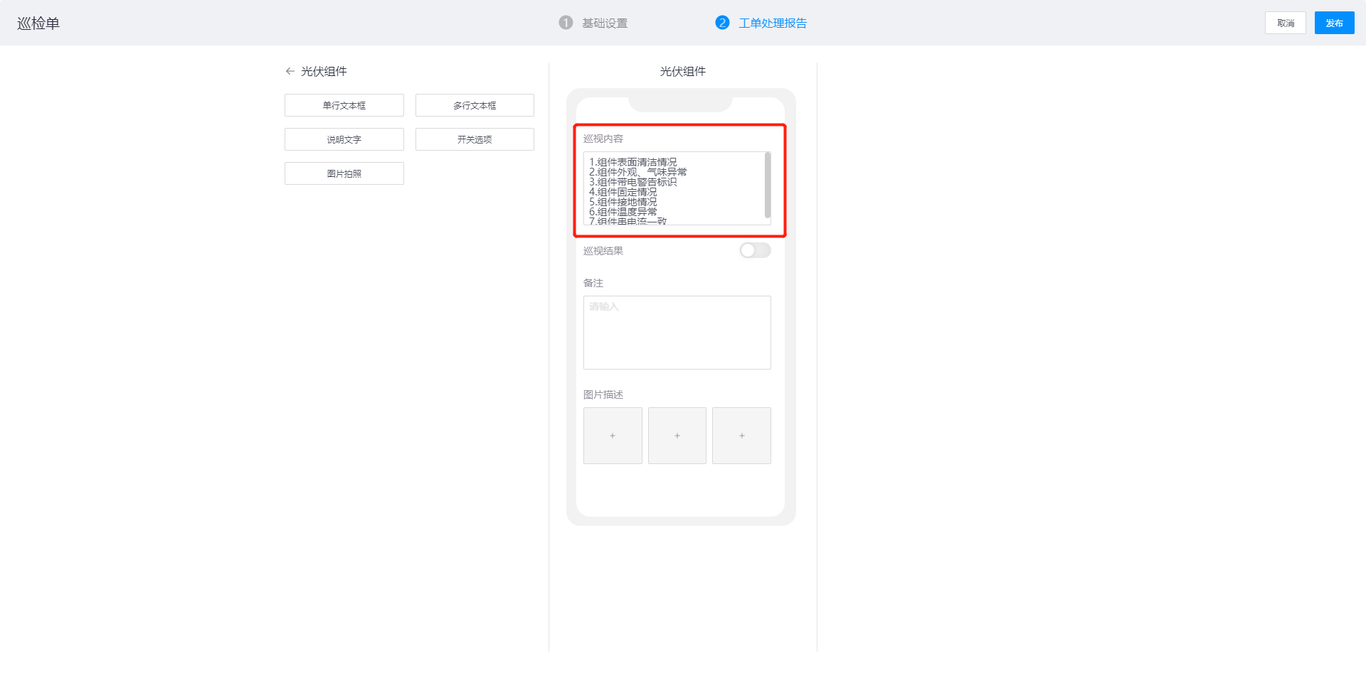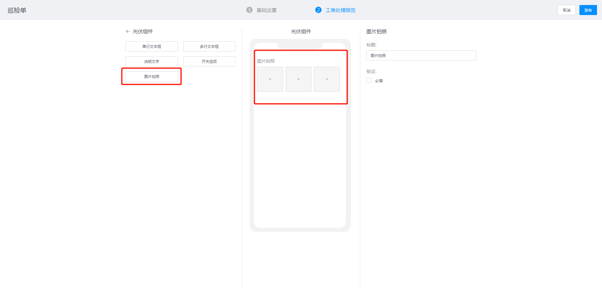 配置内容:标题、验证方式,作用:在提交工单处理报告时上传照片(APP端支持拍照)