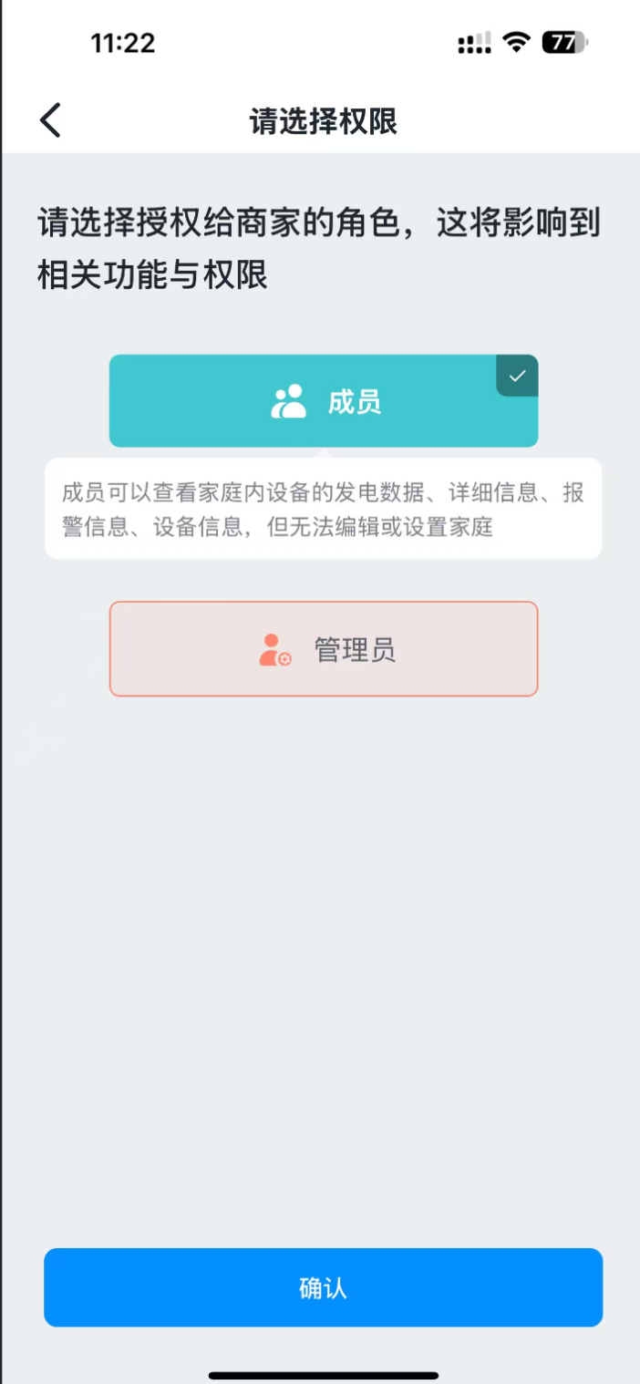 如果您是电站创建者,请在小麦智电中,点击菜单栏-共享-与商家共享-“+”号按钮进行授权,如需要授权安装商仅查看电站权限,请点击成员后确认。如需要授权可编辑权限,请点击管理员后确认。 如果您不是电站创建者,请联系电站创建者进行授权。