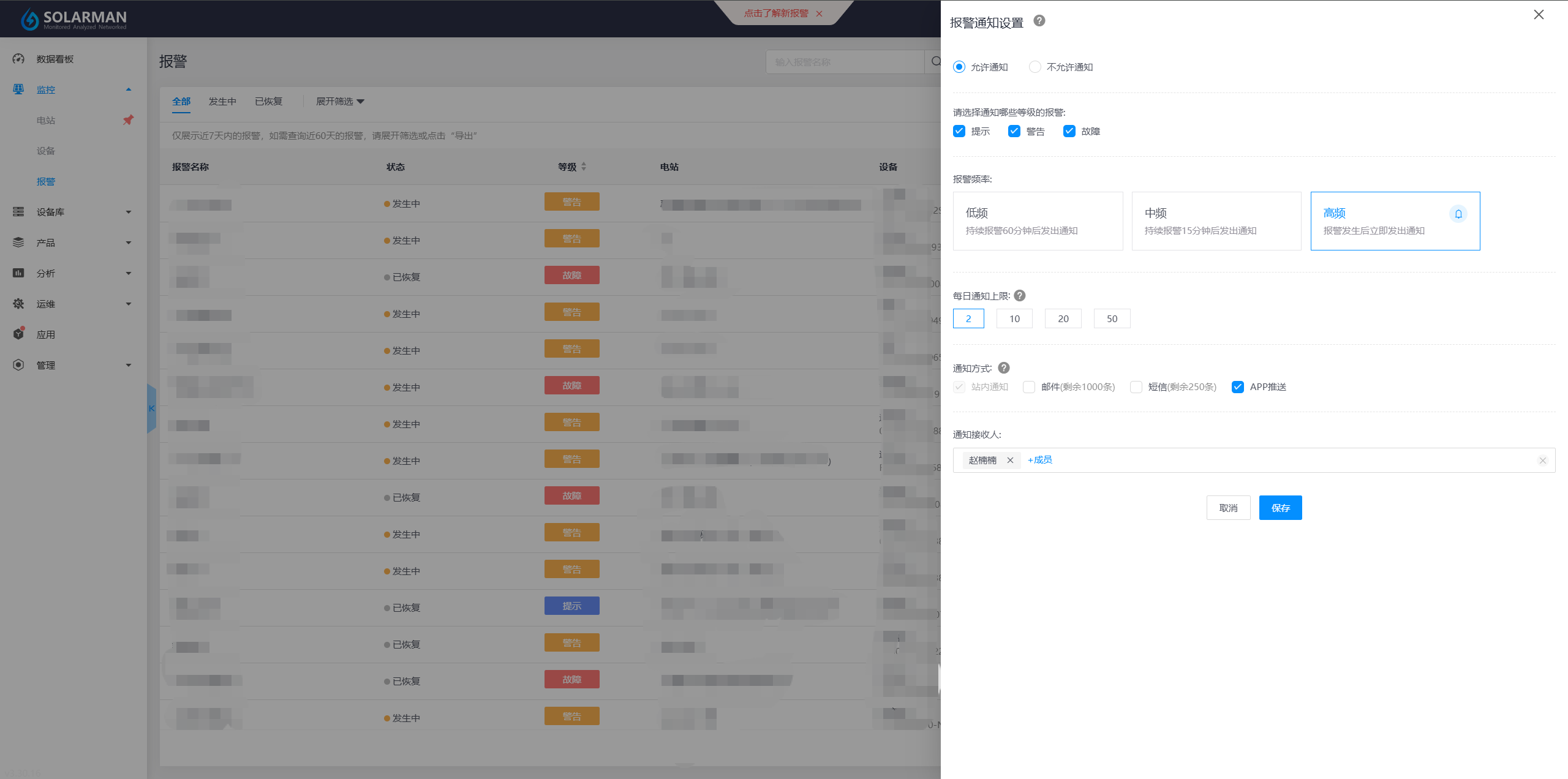 报警通知目前是根据您在系统中的报警通知设置进行推送的,具体请参照功能概述中【报警通知设置】中的”报警频率“和”每日通知上限“。当该电站设备报警处理后,系统更新”恢复时间“后将不再通知。在非通知期间若需要查看报警详情请参照功能概述中【报警详情】查看具体操作。